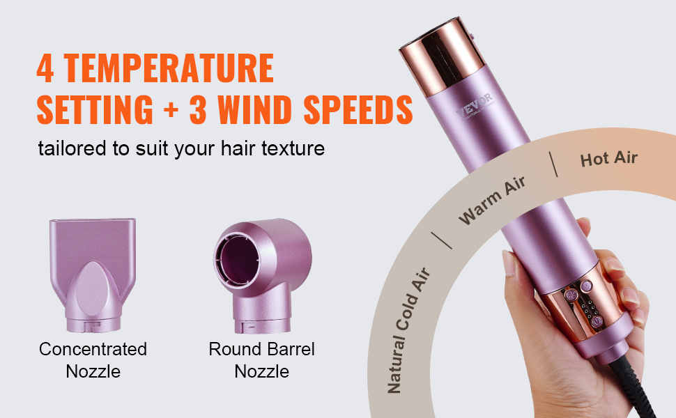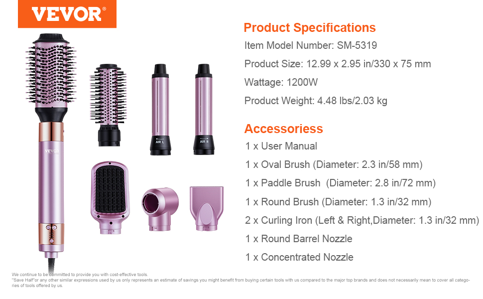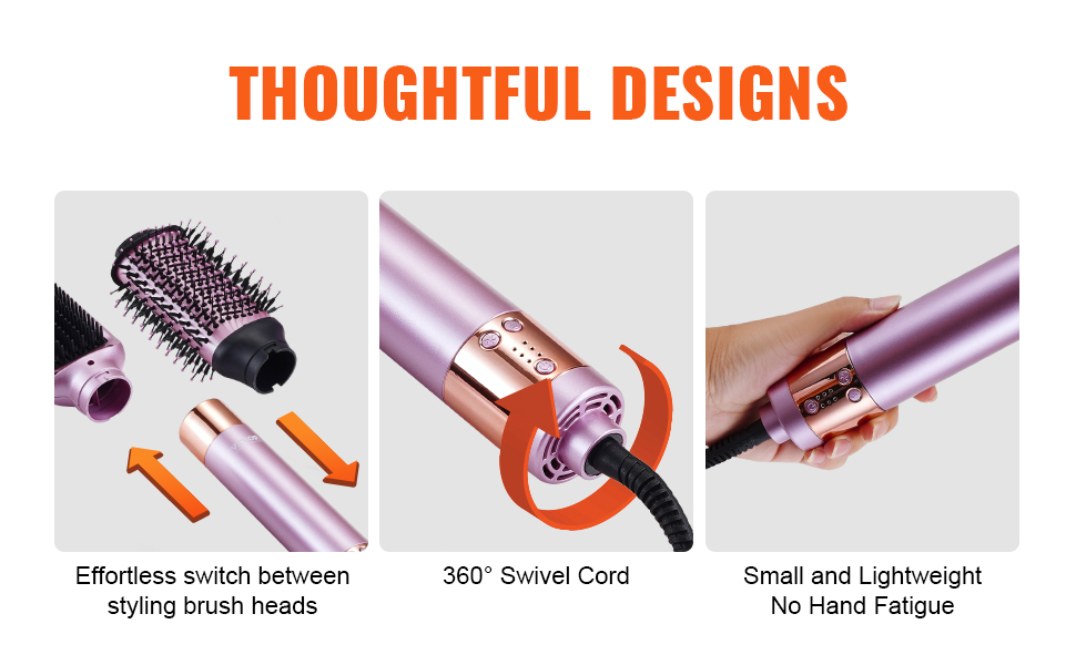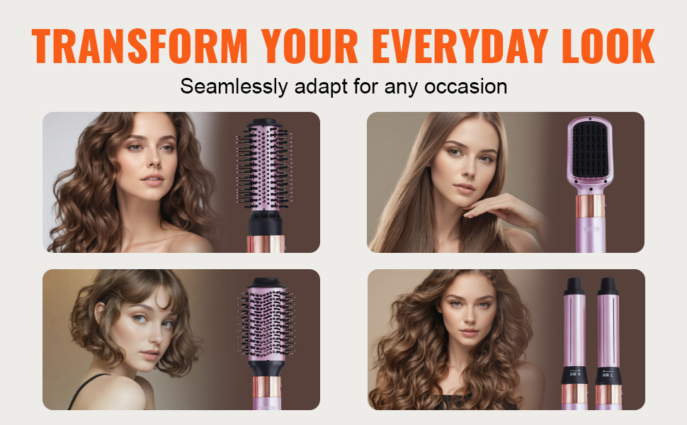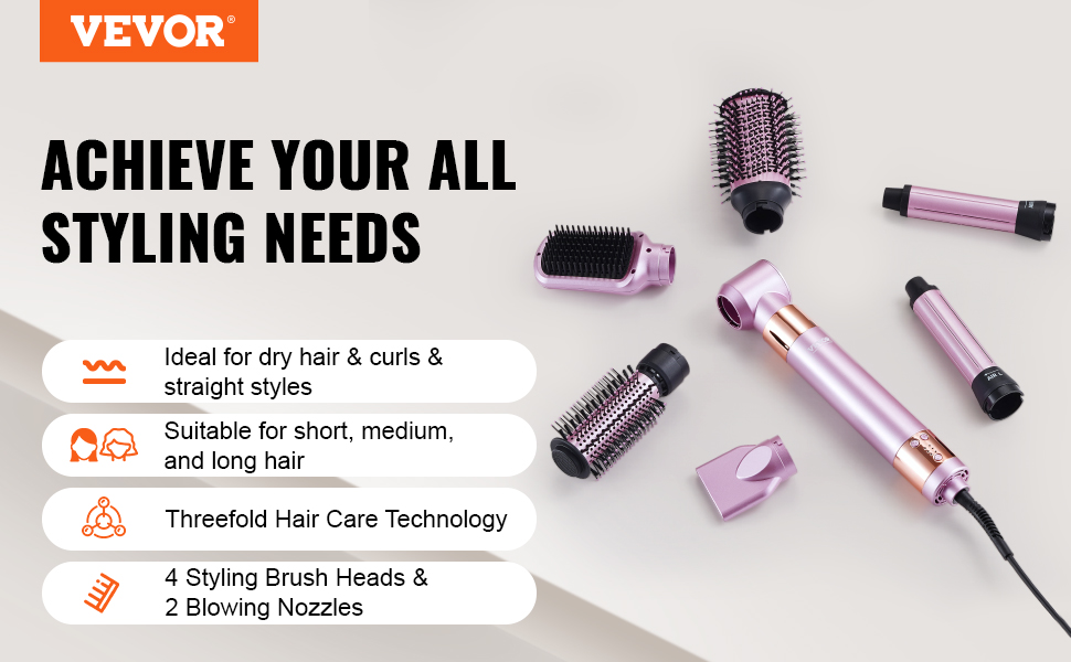Teplovzdušná kefa VEVOR 6 v 1 má 2 kulmy, 3 odnímateľné kefové hlavy a 2 trysky (okrúhla, lopatková a oválna kefa, okrúhla hlavica a koncentrovaná tryska), ktoré vám umožnia bez námahy vytvárať úžasné účesy a profesionálne stylingové efekty.