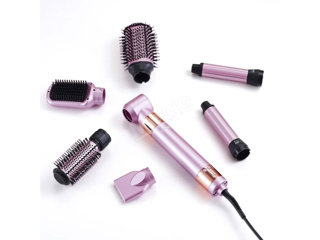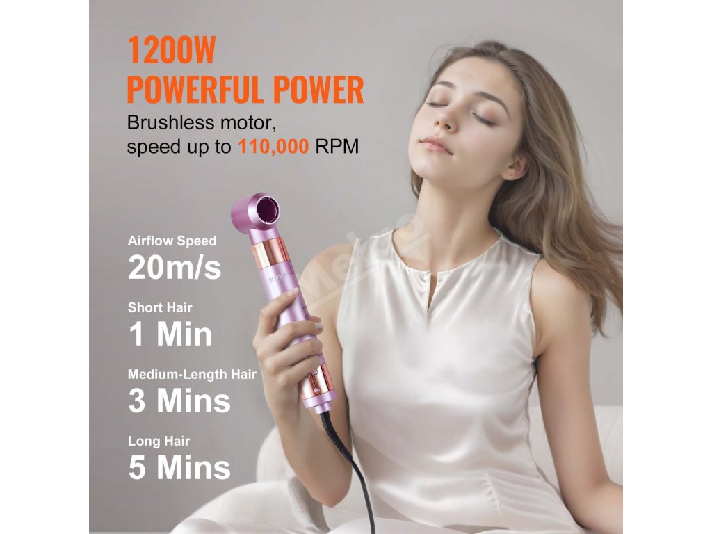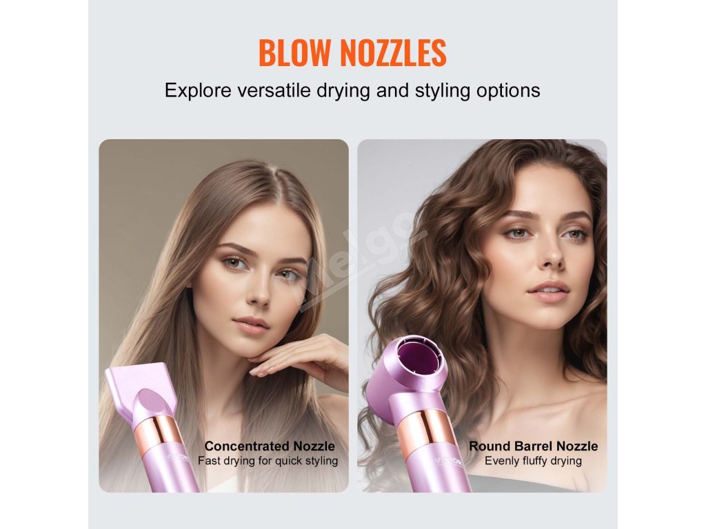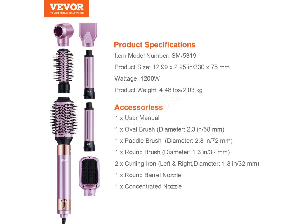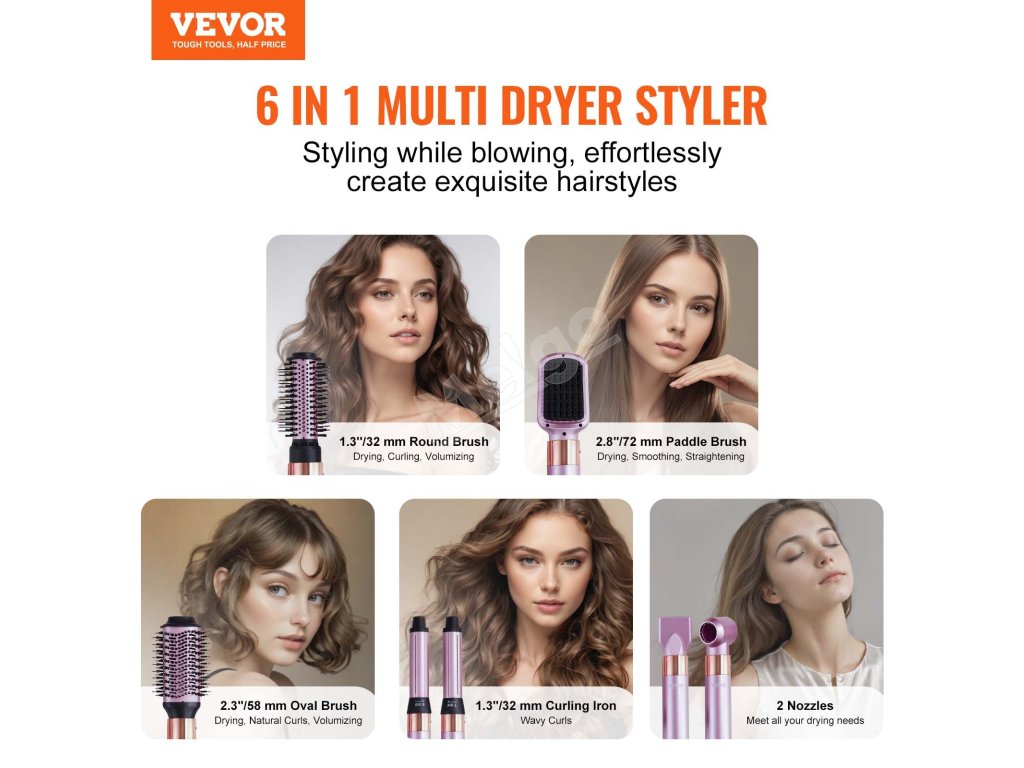 Teplovzdušná kefa VEVOR 6 v 1 má 2 kulmy, 3 odnímateľné kefové hlavy a 2 trysky (okrúhla, lopatková a oválna kefa, okrúhla hlavica a koncentrovaná tryska), ktoré vám umožnia bez námahy vytvárať úžasné účesy a profesionálne stylingové efekty.
