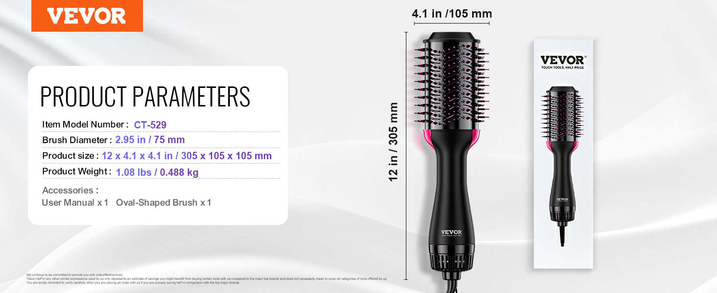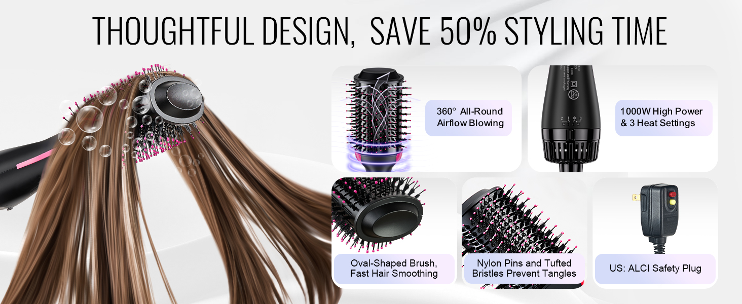 Vychutnajte si hladké účesy bez námahy vďaka nášmu 360° priestorovému prúdeniu vzduchu, ktoré dodáva rovnomerné teplo na zníženie krepovatenia. Oválna kefa s priemerom 2,95 palca (75 mm) je vybavená nylonovými kolíkmi a tupírovanými štetinami, ktoré zabraňujú zamotávaniu vlasov.