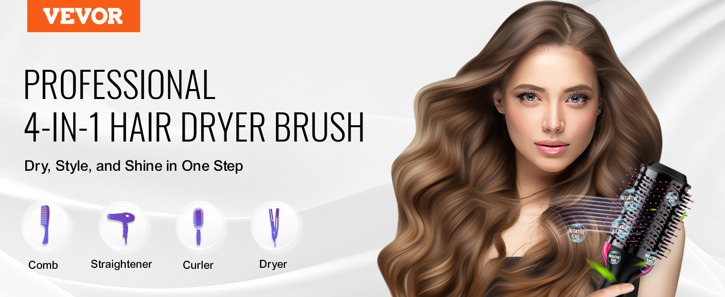 VEVOR kefa na sušenie vlasov 4 v 1: váš stylingový kúzelník! Bez námahy dosiahnete sušenie, kulmovanie, narovnávanie a zväčšovanie objemu, aby ste splnili všetky potreby účesu. Vďaka pokročilému keramickému povlaku a 30 W+ záporným iónom účinne znižuje tepelné poškodenie a zároveň uzamyká vlhkosť pre hladšie a zdravšie vlasy.