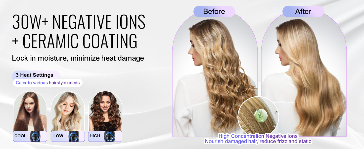 Fén VEVOR kombinuje zdokonalený keramický povlak a 30 W+ vysokokoncentrované záporné ióny na rýchle a rovnomerné rozloženie tepla, ktoré minimalizuje poškodenie vlasov teplom. Účinne znižuje statickú elektrinu a krepatenie a zároveň uzamyká vlhkosť, čo vedie k hladkým, lesklým vlasom so zvýšeným objemom.