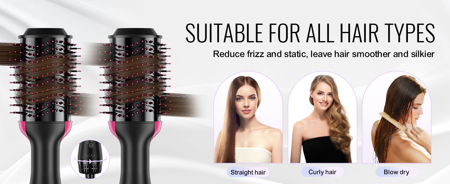 Naša multifunkčná teplovzdušná stylingová kefa je ideálna pre všetky typy vlasov, bez námahy si poradí s rovnými, kučeravými aj sušiacimi sa vlasmi. Vďaka 3 nastaviteľným nastaveniam (chladné, nízke a vysoké) ju môžete ľahko prispôsobiť rôznym potrebám stylingu a ľahko dosiahnuť svoj ideálny vzhľad.