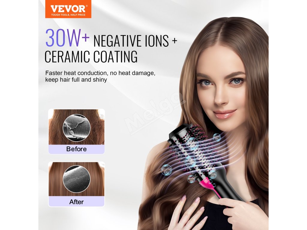 VEVOR kefa na sušenie vlasov 4 v 1: váš stylingový kúzelník! Bez námahy dosiahnete sušenie, kulmovanie, narovnávanie a zväčšovanie objemu, aby ste splnili všetky potreby účesu. Vďaka pokročilému keramickému povlaku a 30 W+ záporným iónom účinne znižuje tepelné poškodenie a zároveň uzamyká vlhkosť pre hladšie a zdravšie vlasy.