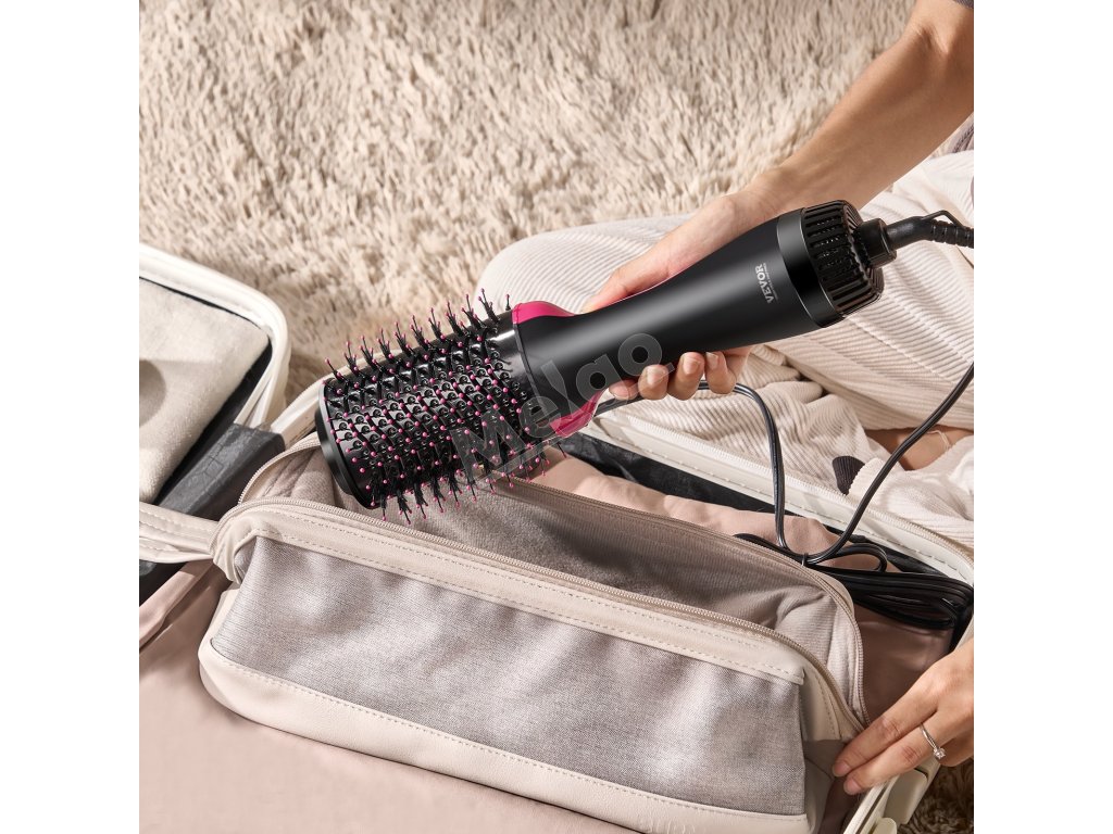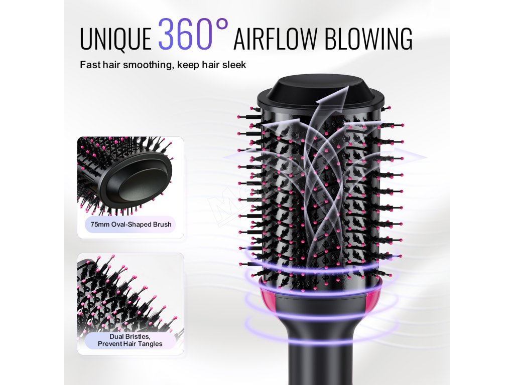 Vychutnajte si hladké účesy bez námahy vďaka nášmu 360° priestorovému prúdeniu vzduchu, ktoré dodáva rovnomerné teplo na zníženie krepovatenia. Oválna kefa s priemerom 2,95 palca (75 mm) je vybavená nylonovými kolíkmi a tupírovanými štetinami, ktoré zabraňujú zamotávaniu vlasov.