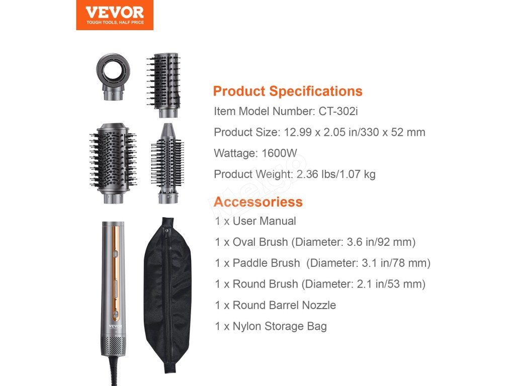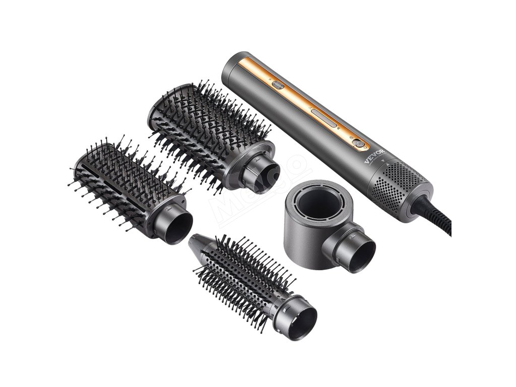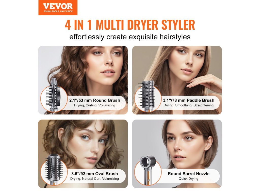 Fénová kefa VEVOR 4 v 1 je vybavená 3 kefovými hlavicami a 1 tryskou (okrúhla, lopatková a okrúhla kefa, okrúhla hlavňová tryska), vďaka ktorým môžete bez námahy vytvárať nádherné účesy a dosiahnuť všestranný stylingový efekt.