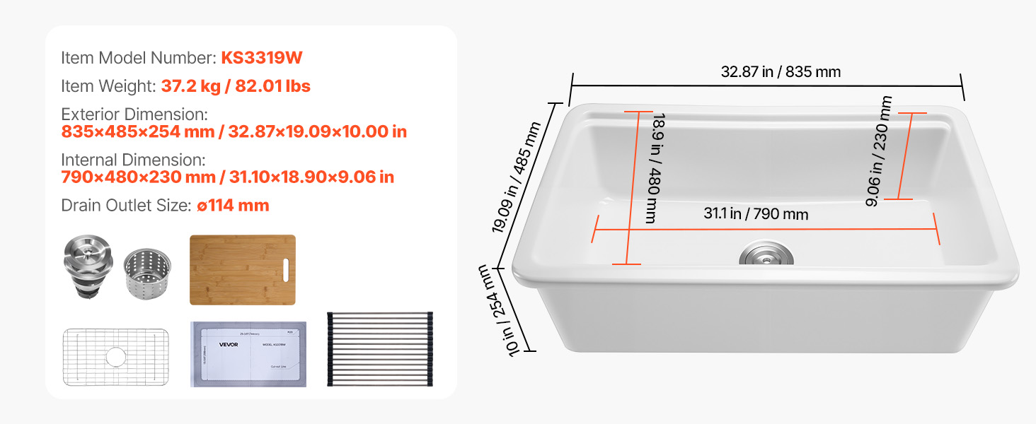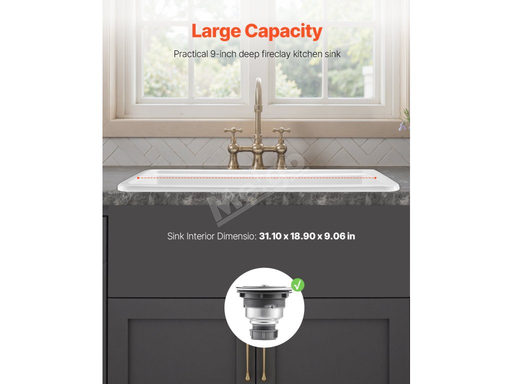 Súčasťou umývadla Farmhouse je balík inštalačného príslušenstva, ktorý je vhodný pre 90 % štandardných skriniek. Odsadená konštrukcia odtoku 114 mm / 4,49 palca umožňuje bezproblémové pripojenie na odpad.
