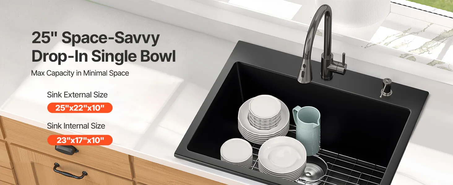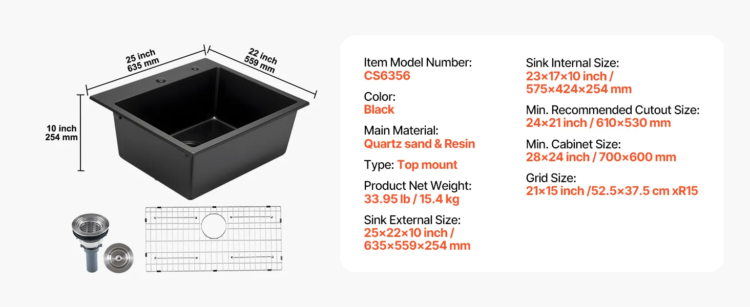 | Vonkajšia veľkosť drezu | 25x22x10 palcov /635x559x254 mm |