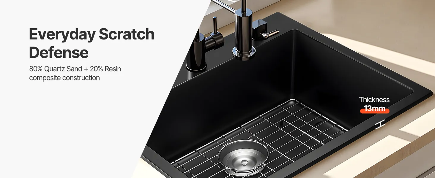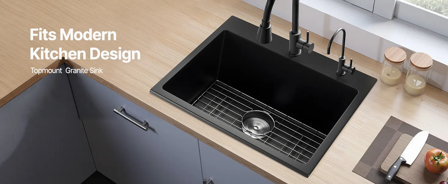 Náš granitový kuchynský drez má hladký matný čierny povrch s jemným luxusom, ktorý s rafinovanou eleganciou dopĺňa moderné kuchyne a elegantné bary. Praktický a ľahko udržiavateľný kuchynský drez s hornou montážou povýši každodenné kuchynské úlohy na príjemný zážitok.
