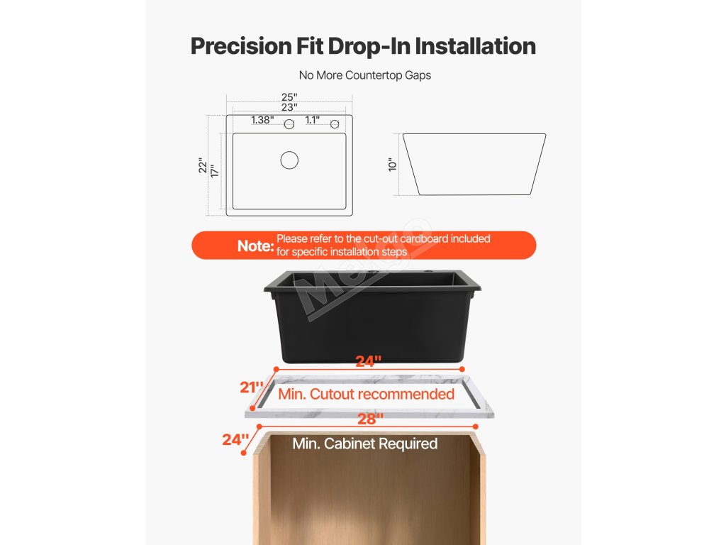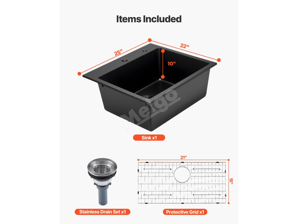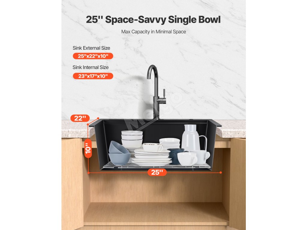 | Vonkajšia veľkosť drezu | 25x22x10 palcov /635x559x254 mm |