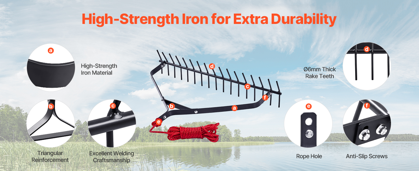 Vyrobené z vysokopevnostného železa, tieto hrable na jazierko zostávajú vo vode odolné. Vďaka zosilnenej trojuholníkovej štruktúre a kvalitnému zváraniu zaručuje stabilitu a dlhú životnosť. Protišmykové skrutky a oká na lano poskytujú dodatočnú bezpečnosť.