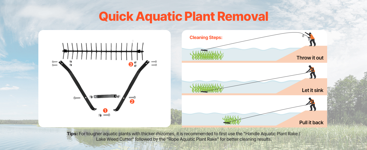Tento vodný hrablič na burinu vybavený lanom s dĺžkou 30 stôp (9 m) je skvelý na hlboké vodné plochy. Sieťové vrecko pomáha zhromažďovať odstránenú burinu a nečistoty na efektívne čistenie.