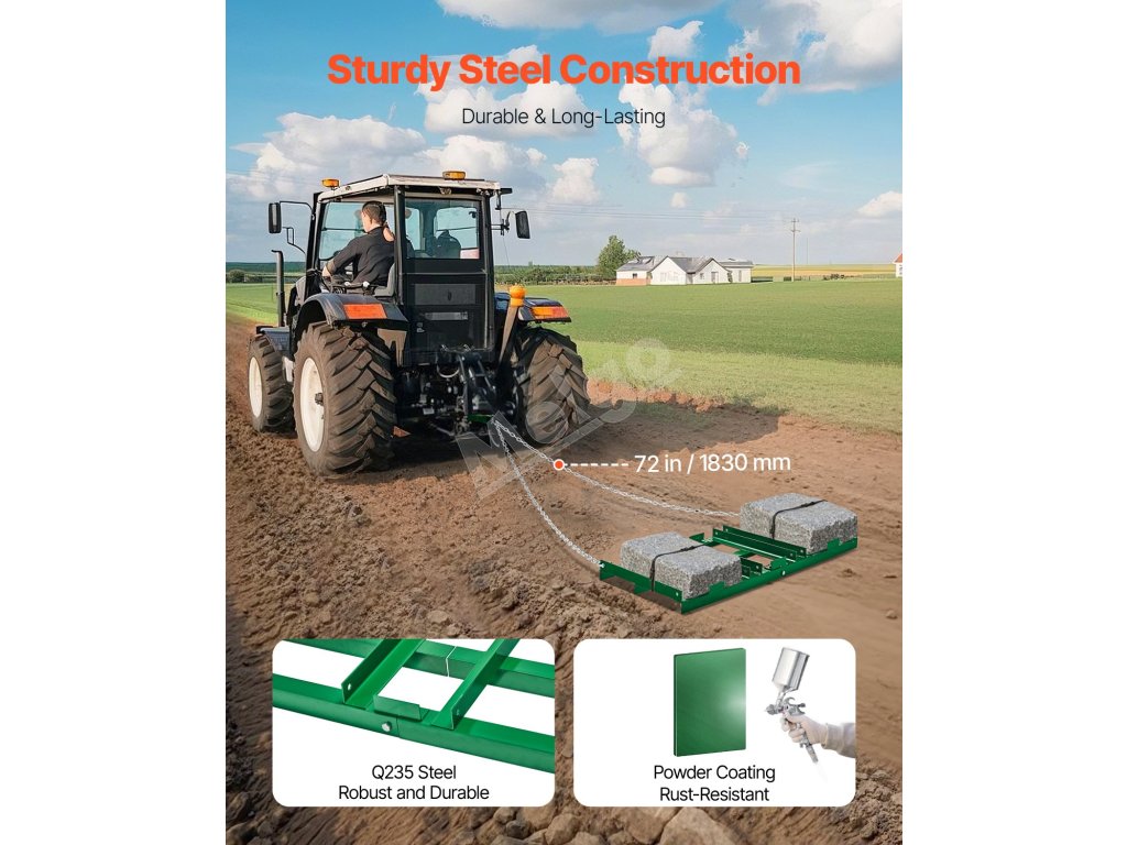 Táto vlečná brána vyrobená z vysokopevnostnej ocele Q235 sa ľahko prispôsobí náročnému terénu a kamenistému povrchu. Povrchová úprava odolná proti korózii zaisťuje dlhodobú odolnosť v premenlivom počasí, vďaka čomu budú vaše úlohy pri obhospodarovaní pôdy efektívne v akomkoľvek prostredí.