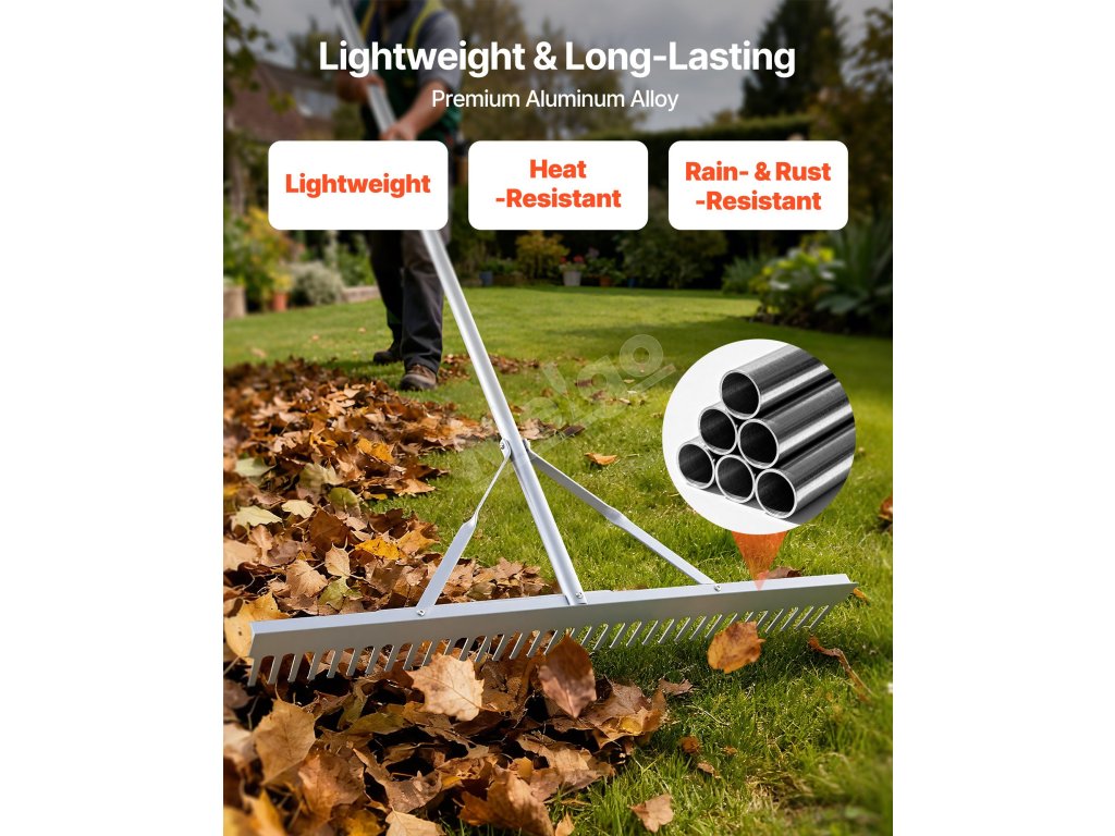 Hrable na lístie sú vyrobené z rukoväte a hlavy z hliníkovej zliatiny, vystužené robustným trojuholníkovým rámom, sú odolné proti vode a hrdzi, korózii a udržiavajú tvar. Je vhodné na čistenie lístia, odstraňovanie plávajúcich nečistôt a zabezpečuje dlhodobé používanie v exteriéri.