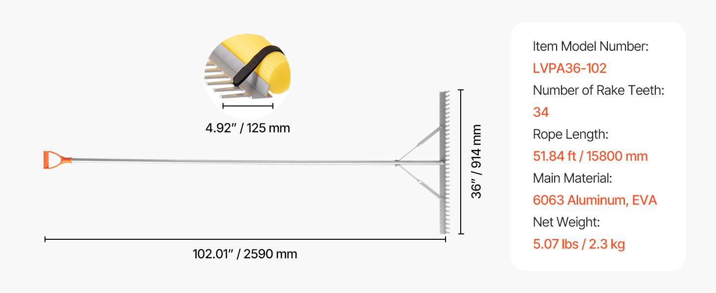 Vďaka rukoväti z PP v tvare písmena D poskytujú naše záhradné hrable protišmykový a bezpečný úchop. Jeho bezpečné skrutky udržiavajú hlavu pevne na mieste, zatiaľ čo jasne žltá plávajúca pena zlepšuje viditeľnosť a poskytuje vznášanie. Jeho súčasťou je aj lano s dĺžkou 51,84 m, ktoré rozširuje dosah čistenia pre vyššiu účinnosť.