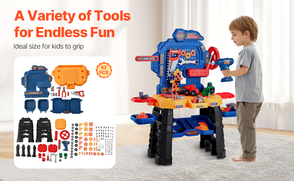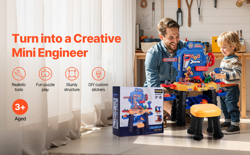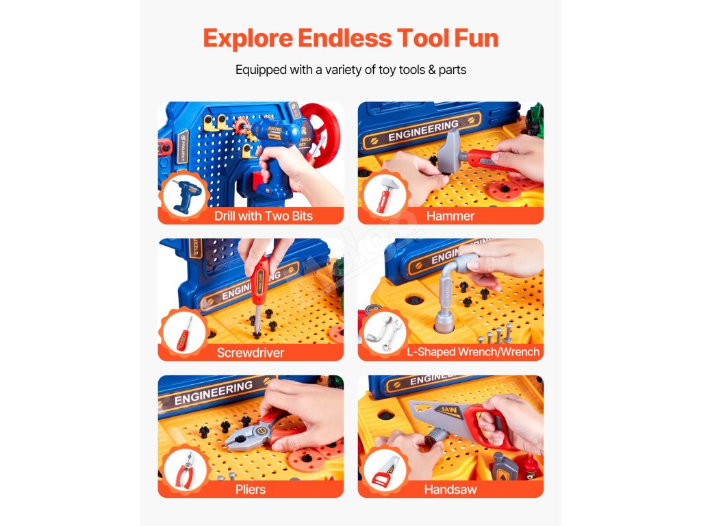 Nechajte svoje dieťatko hrať sa na remeselníka! S hračkárskou vŕtačkou, kľúčom, pílou a ďalšími pomôckami sa deti naučia používať skutočné nástroje. Samolepky "urob si sám" na našom pracovnom stole pre batoľatá im umožňujú prispôsobiť si pracovný priestor pre nekonečnú zábavu a tvorivosť.