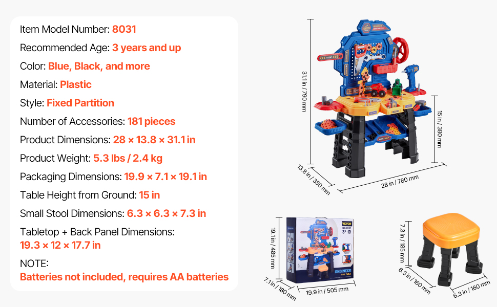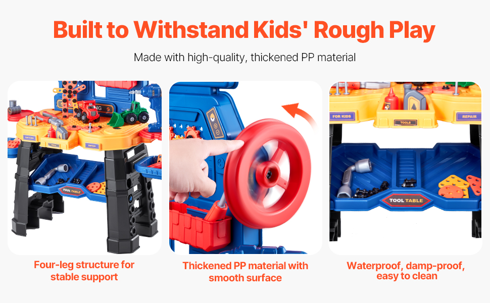 Bezpečnosť na prvom mieste! Táto pracovná lavica pre batoľatá je vyrobená z vysokokvalitného hrubého PP materiálu s hladkým povrchom a bez ostrých hrán, ktorý je skvelý na drsnú hru detí. Jej robustná konštrukcia so štyrmi nohami zaručuje dlhodobé používanie.
