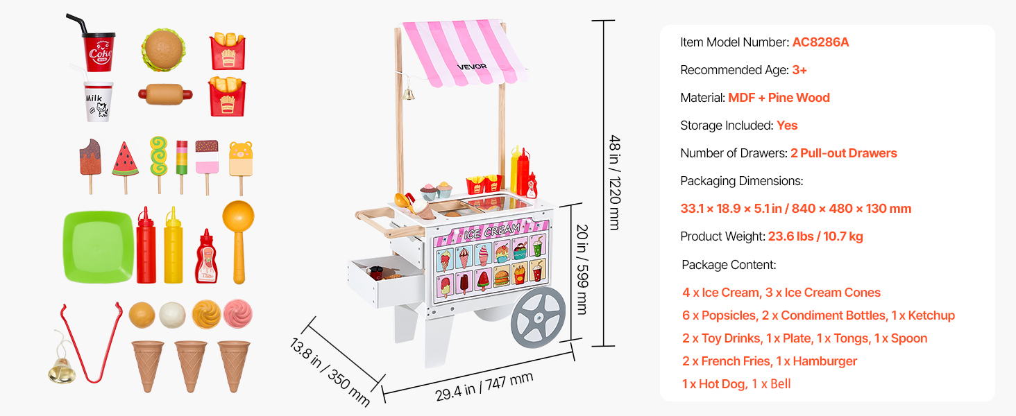 Dvojnásobná zábava! Táto detská zmrzlinárska súprava kombinuje zmrzlinárske auto a vozík na hot-dogy, takže deti môžu predstierať, že riadia obidve. So všetkými zábavnými doplnkami si môžu vytvoriť vlastné potravinárske impérium. Nechajte sa unášať fantáziou!