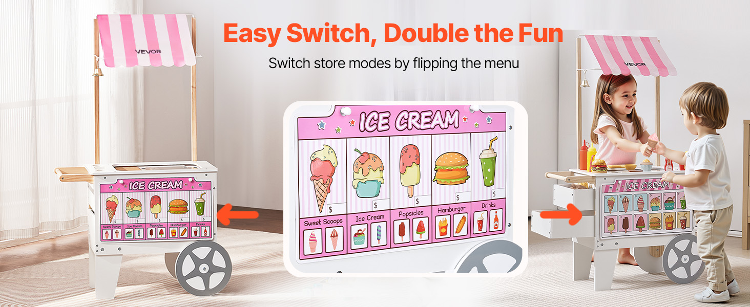 Vymeň to! Otočte menu a v priebehu niekoľkých sekúnd sa z vozíka na zmrzlinu zmeníte na vozík s hotdogmi. S roztomilou strieškou a množstvom zábavného príslušenstva je ideálny na podnecovanie kreativity a predstieranej hry.