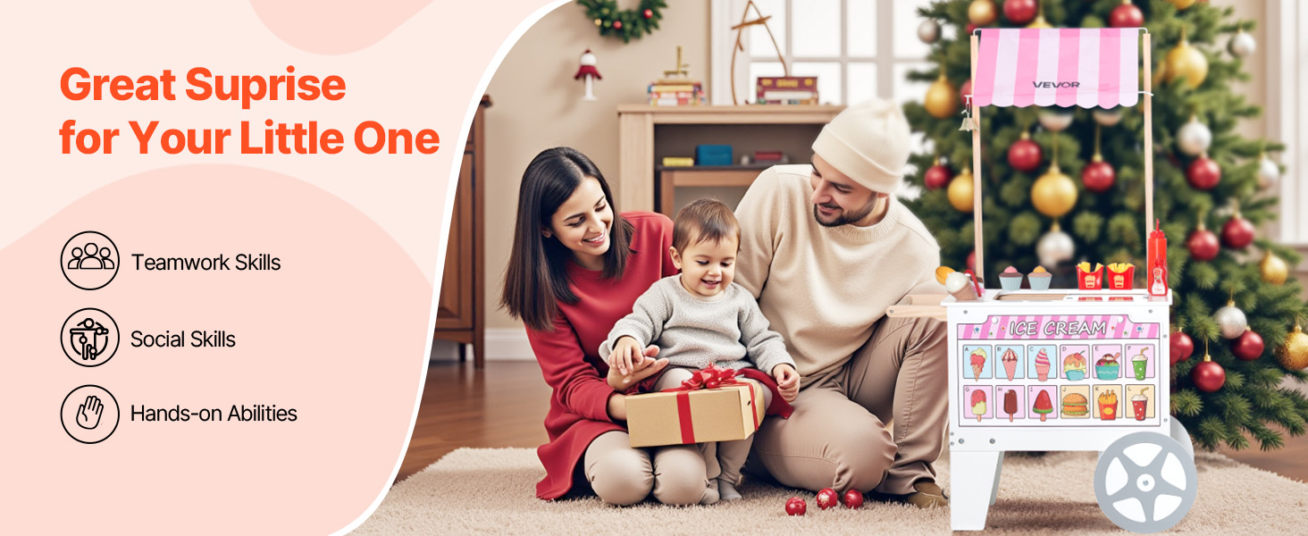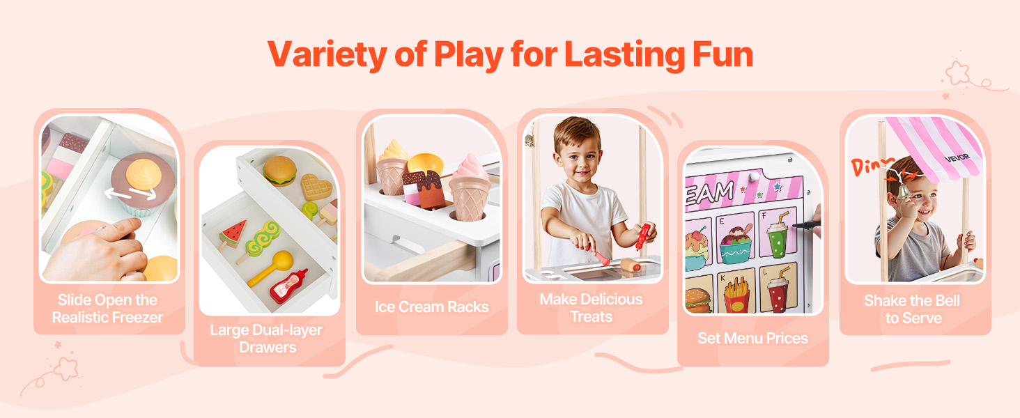 Vyrobte zmrzlinu, hotdogy alebo hamburgery - táto hračka zmrzlinárskeho vozíka má všetko! S úložným priestorom na všetky dobroty a zvončekom na zvonenie môžu deti nastavovať ceny a hrať sa na predavačov, pričom si užijú nekonečnú zábavu.
