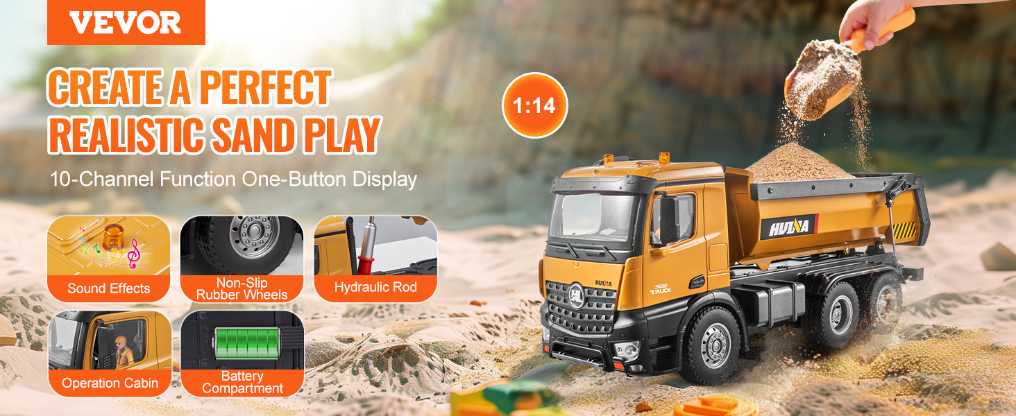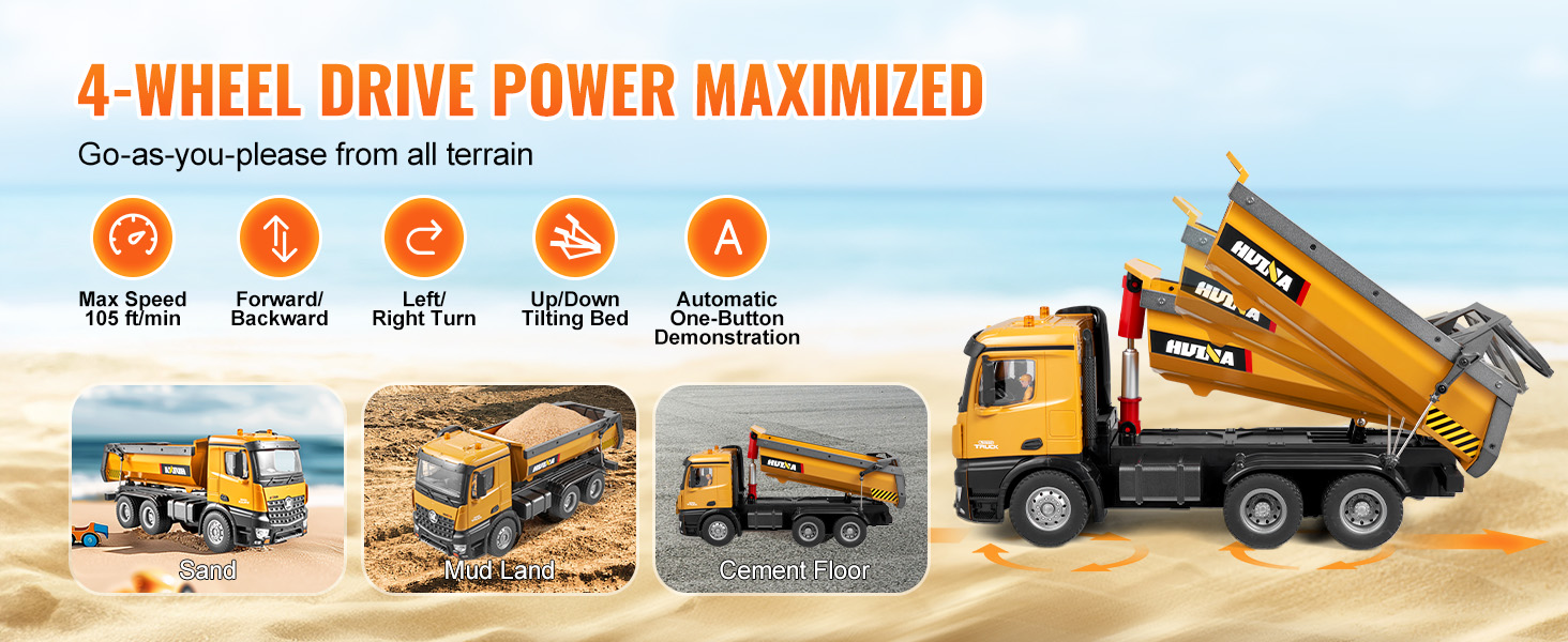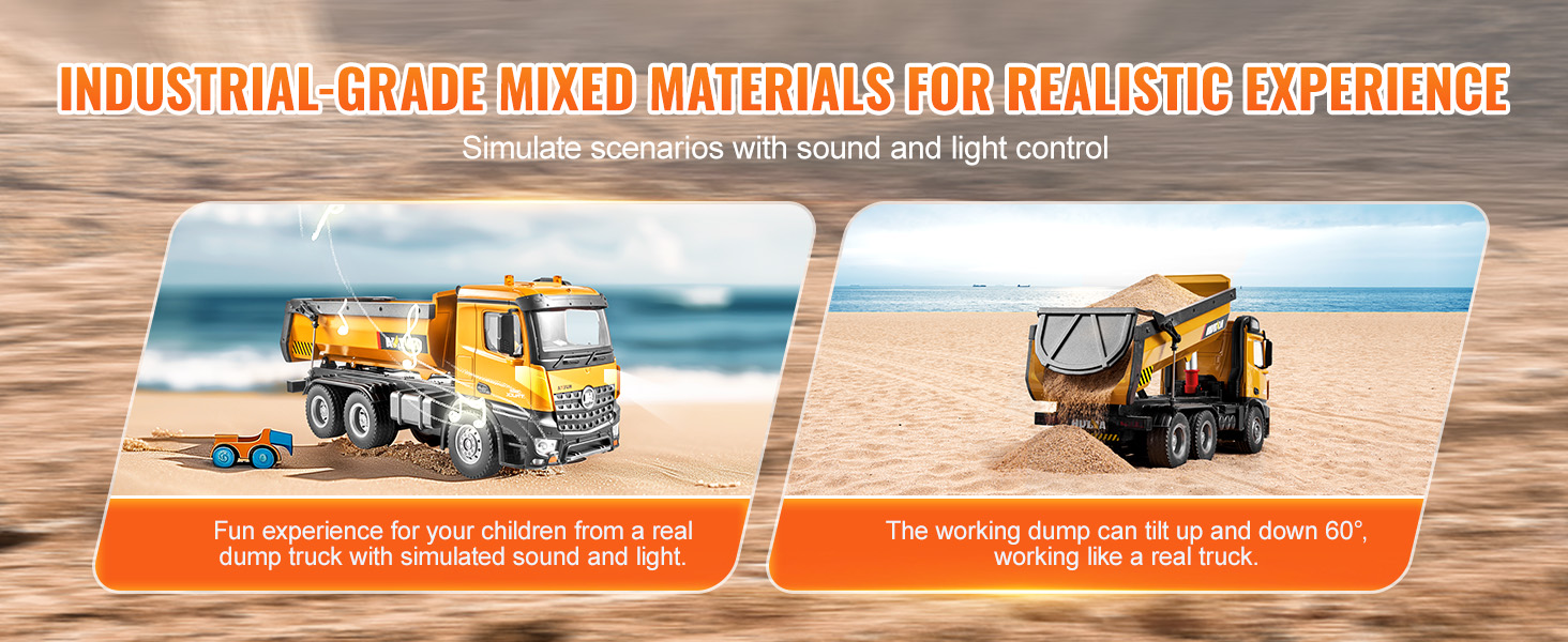 S ľahkosťou si poradí s akýmkoľvek terénom! Tento sklápač na diaľkové ovládanie bez námahy zvládne hrboľaté cesty aj hladké cesty, vďaka čomu si užijete vzrušujúcu jazdu. Vychutnajte si rôzne jazdné režimy a preskúmajte rôzne prostredia.