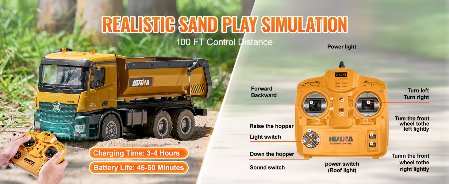 Ovládajte diaľkovo ovládaný sklápač až zo vzdialenosti 100 metrov a oživte scény na pieskovisku! Rýchlo sa nabíja a dlho funguje, takže si môžete užívať nekonečnú hru bez obáv o batériu.