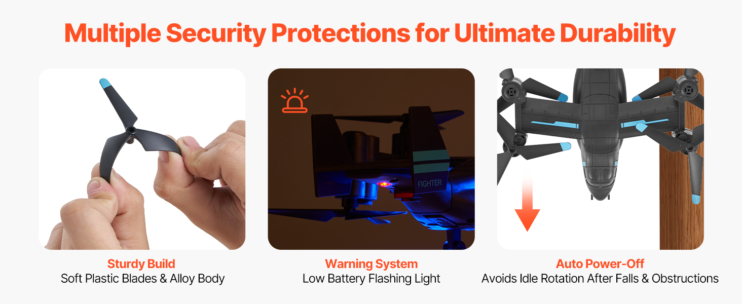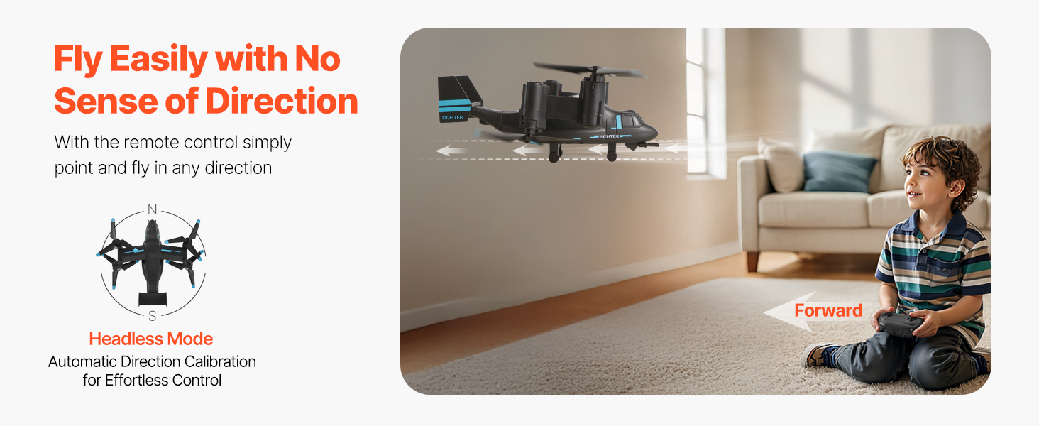 Vďaka automatickej kalibrácii gyroskopu a presmerovaniu signálu diaľkového ovládania umožňuje bezhlavý režim, aby vrtuľník letel tam, kam ukazuje diaľkové ovládanie, čo deťom uľahčuje lietanie bez obáv o orientáciu.