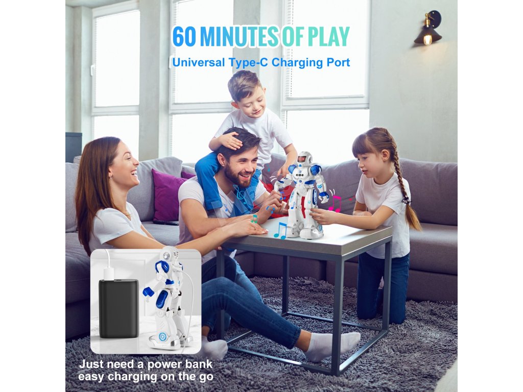 Robotickú hračku ľahko dobijete pomocou USB. Má batériu s dlhou výdržou, ktorá je pripravená na zábavu kedykoľvek, či už v interiéri alebo vonku.