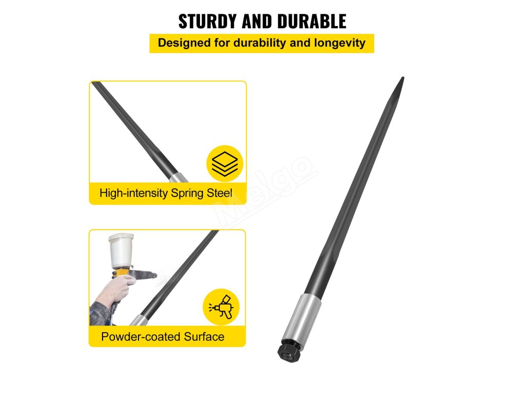 Ide o silnú oceľovú tyč. Táto oceľová tyč je navrhnutá na dlhú životnosť. Je vyrobená z vysokopevnostnej pružinovej ocele 60Si2Mn. Oceľová tyč je nielen pevná, ale aj odolná. Je odolná voči ohýbaniu a lámaniu, čo znamená, že zvládne opakované používanie bez opotrebovania. Čo by ste mali vedieť o oštepe na balíky VEVOR, je, že povrch oštepu je potiahnutý práškovou farbou. To znamená, že dlhšie odoláva korózii a lepšie funguje. Práškové lakovanie tiež zvyšuje jeho celkovú odolnosť. Môžete ho používať roky bez obáv z opotrebovania.