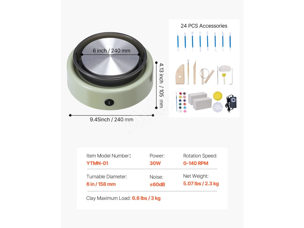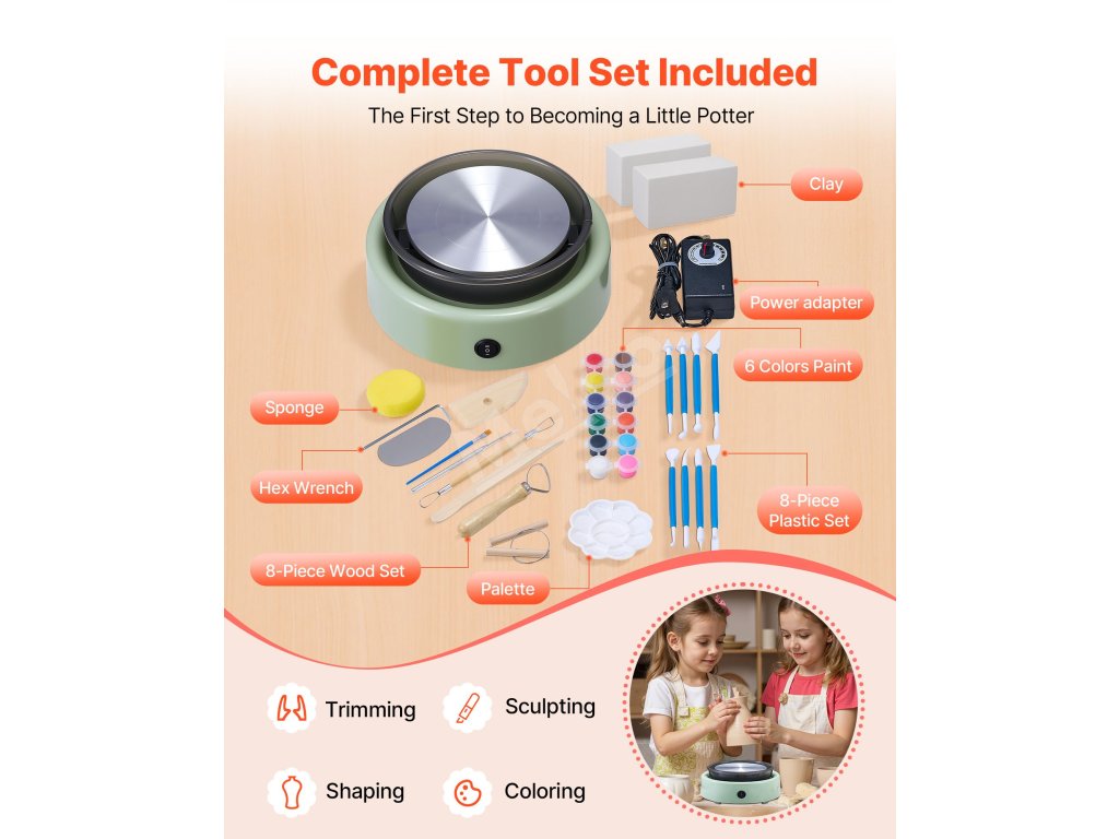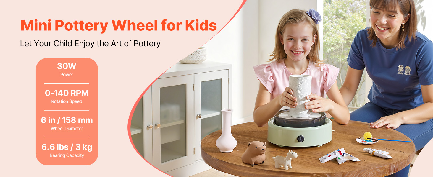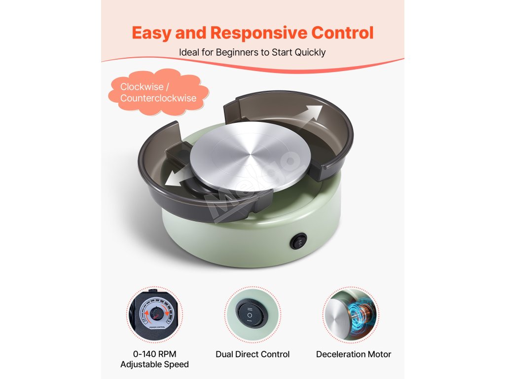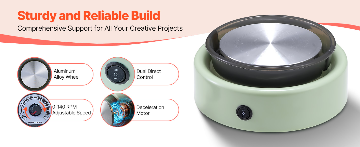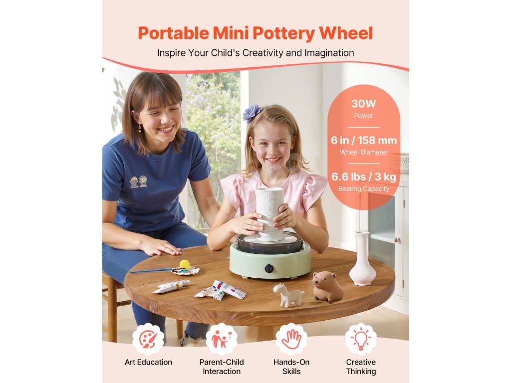 Tento hrnčiarsky kruh pre deti je vybavený 30W motorom a plynulou reguláciou otáčok (0-140 ot./min.), vďaka čomu rastie spolu s ich zručnosťami. Hliníkový otočný stôl s priemerom 6 palcov unesie až 6,6 kg hliny, čo deťom uľahčuje voľné tvarovanie ich nápadov.