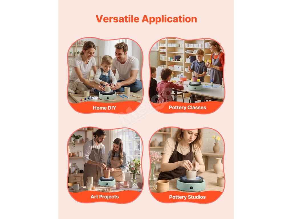 Tento malý hrnčiarsky kruh s nastaviteľnou rýchlosťou, skonštruovaný s robustným hliníkovým kolieskom a obojsmerným prepínačom na otáčanie dopredu/dozadu, podporuje viac kreatívnych techník. Vďaka protišmykovej základni je stroj počas používania stabilný, čo deťom poskytuje stabilný zážitok z tvorby.