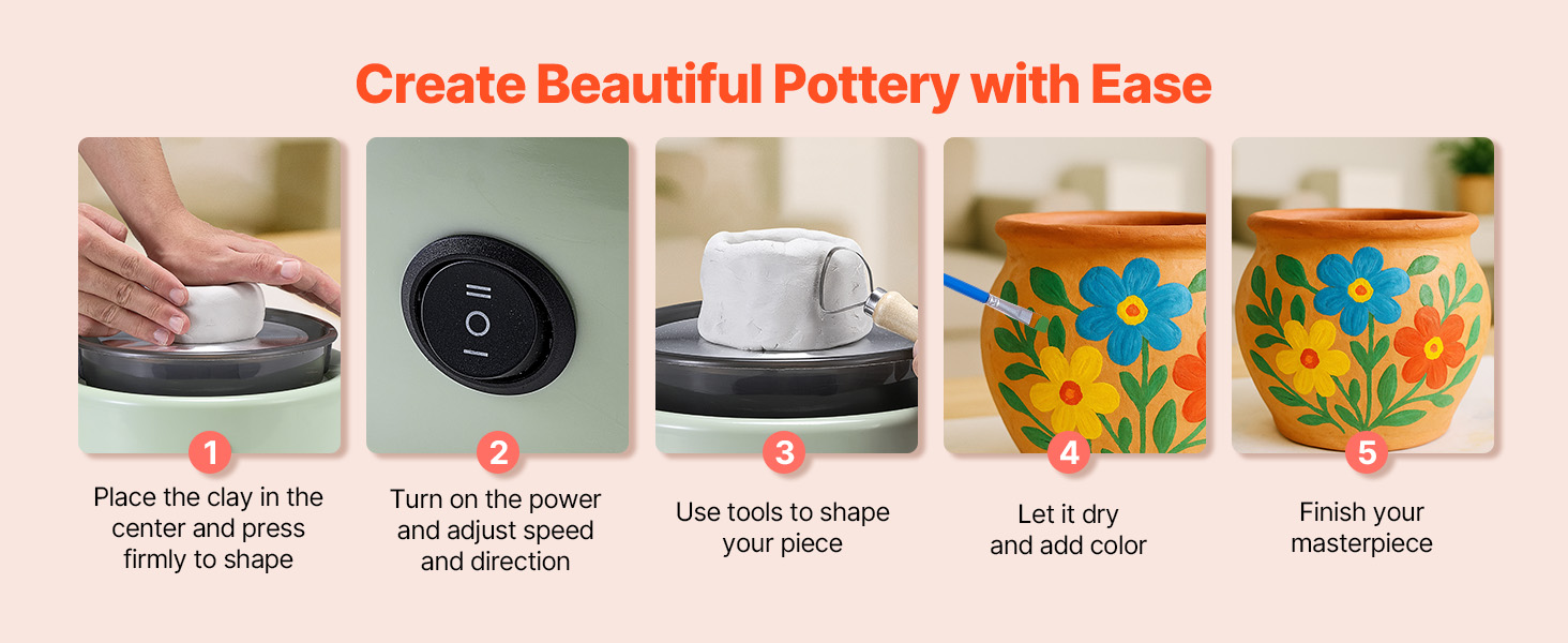 Súprava hrnčiarskeho kruhu pre deti sa dodáva s prehľadným návodom na použitie. Či už ide o začiatočníkov, alebo malé deti, je jednoduché sa ho naučiť a ovládať - pomôže im rýchlo dokončiť keramické diela a začať ich umeleckú cestu.