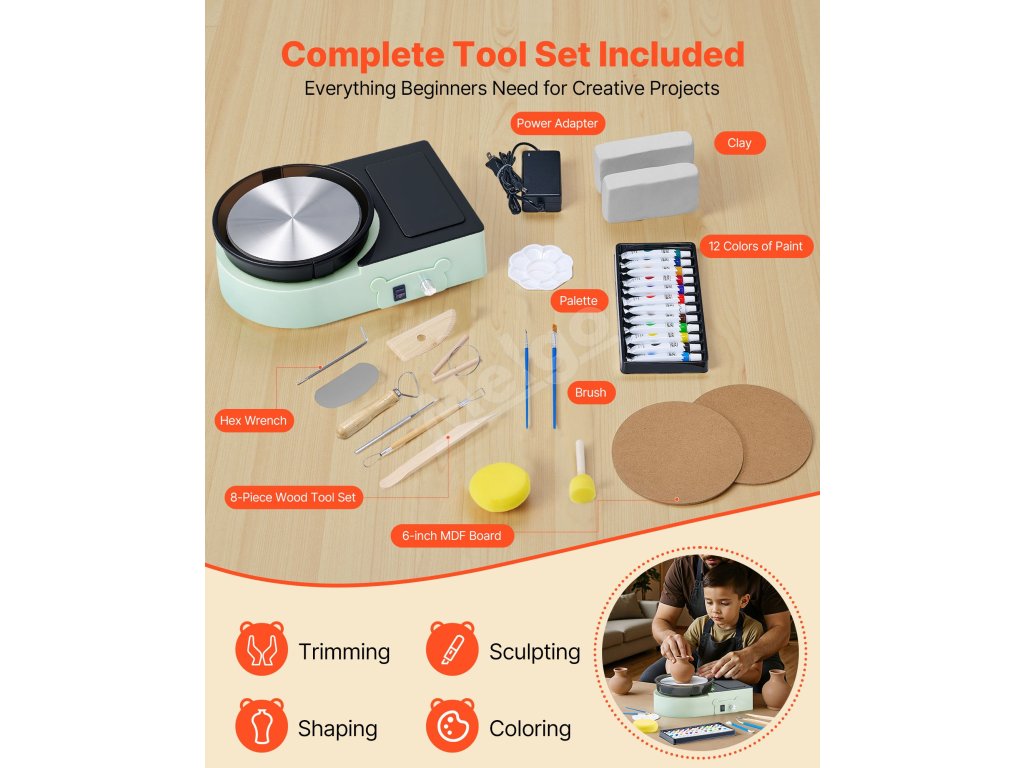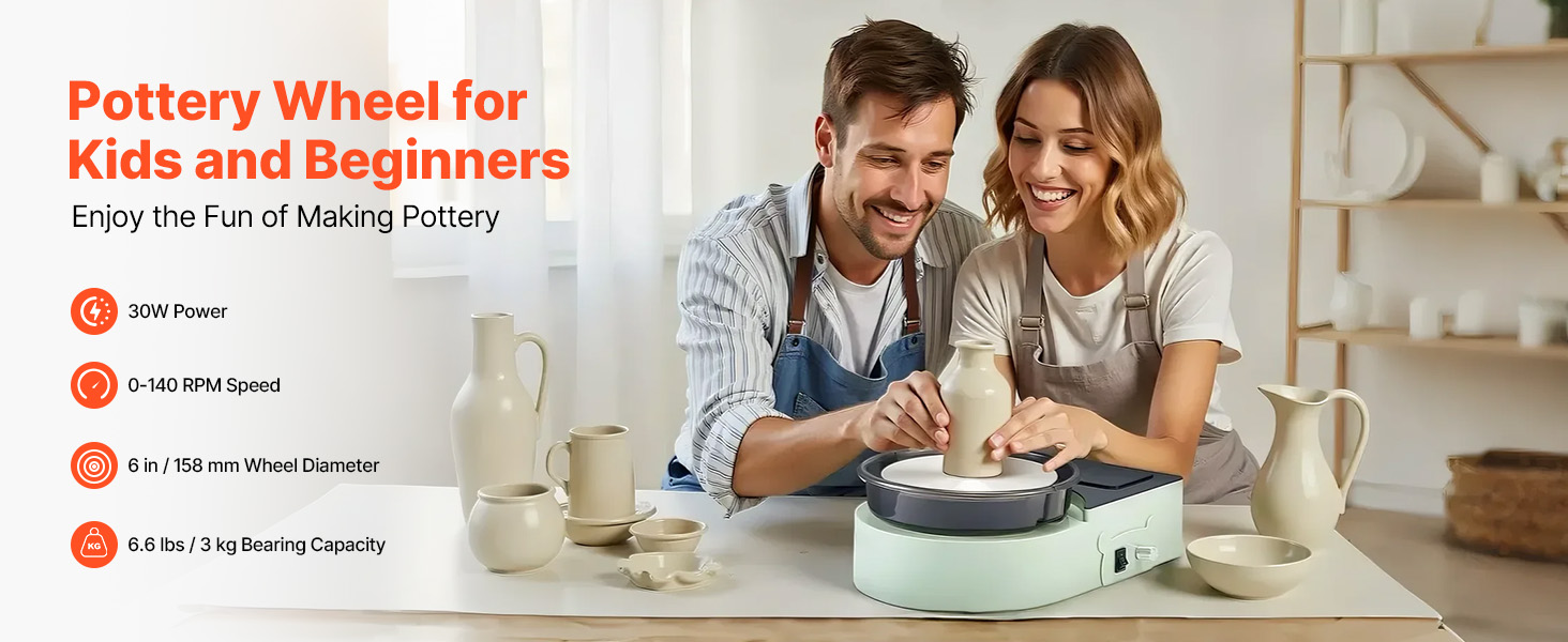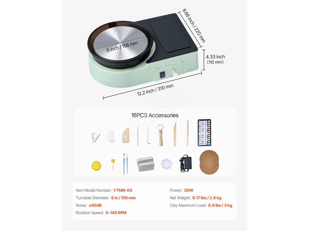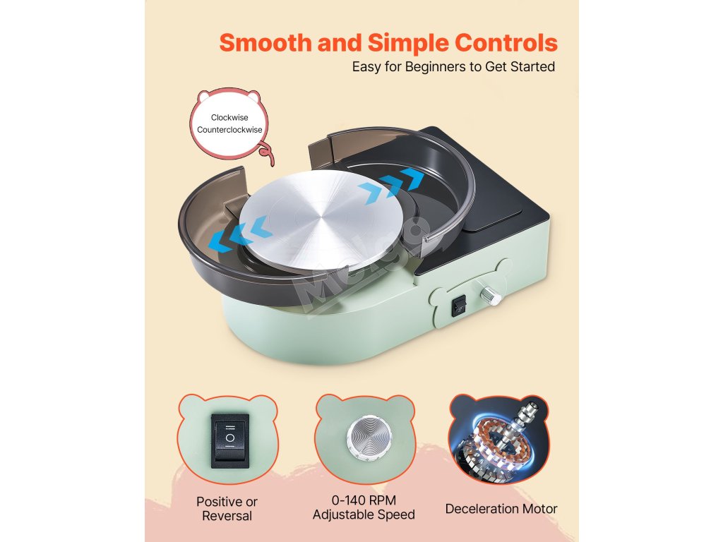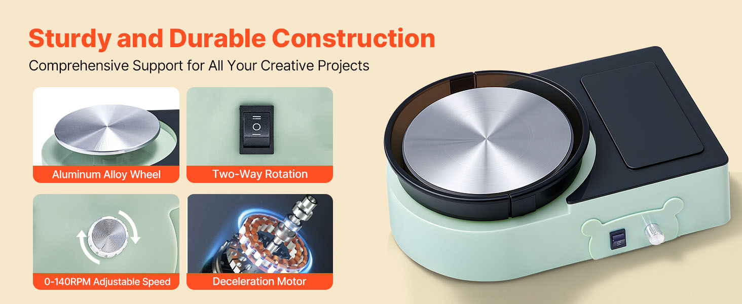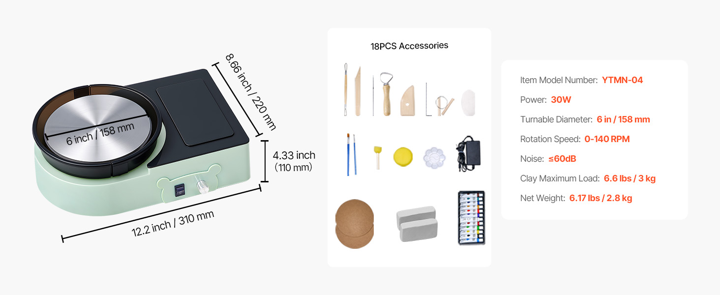 Tento hrnčiarsky kruh je určený pre deti a začiatočníkov a poskytuje stabilný rozsah 0-140 otáčok za minútu s výkonným 30W motorom. Šesťpalcový hliníkový otočný stôl udrží až 6,6 libier / 3 kg hliny, čo umožňuje používateľom všetkých úrovní zručností užiť si zábavu pri tvorbe keramiky s ľahkosťou.