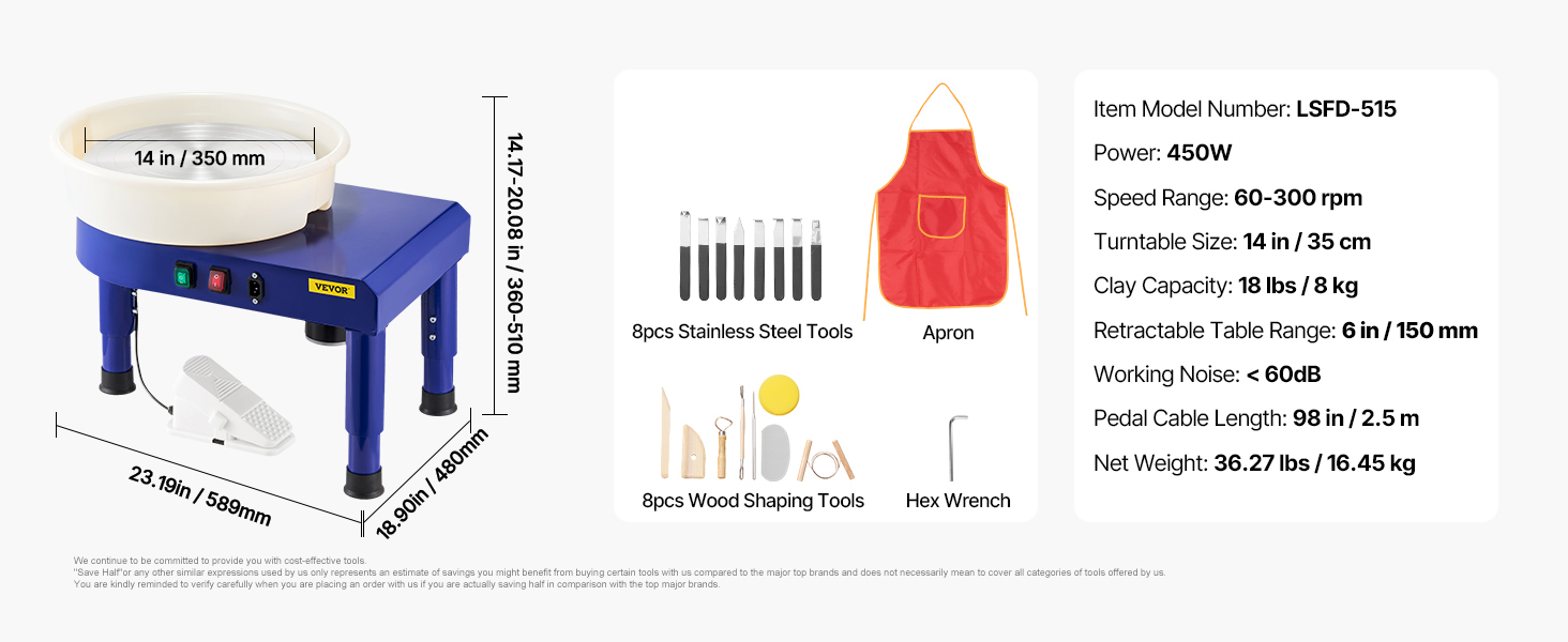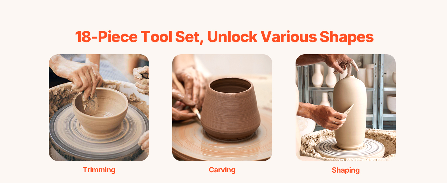 Náš elektrický hrnčiarsky kruh sa dodáva so súpravou 8 nástrojov z nehrdzavejúcej ocele, 8-dielnou drevenou súpravou nástrojov, nepremokavou zásterou, ktorá udrží vaše oblečenie čisté, a šesťhranným kľúčom. Užite si nekonečné možnosti vyrezávania a tvarovania s ľahkosťou.
