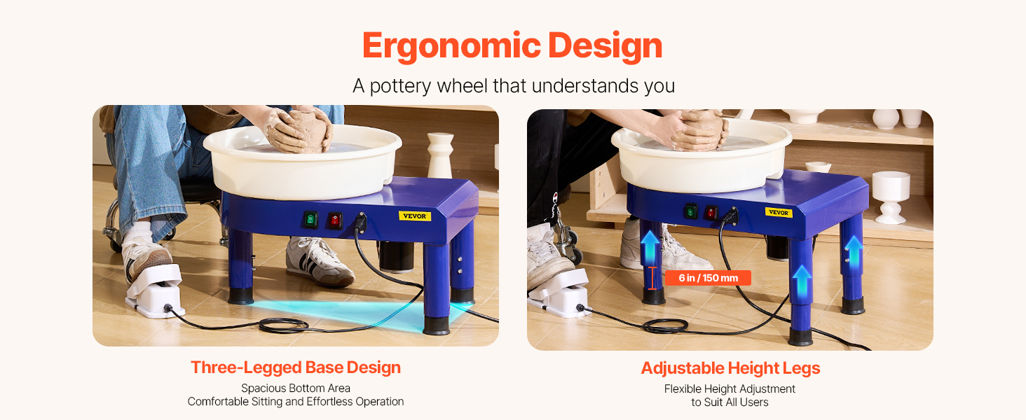 Náš novovylepšený stroj na tvarovanie keramiky možno bez námahy zdvíhať a spúšťať v rozsahu 0 - 6 palcov / 0 - 150 mm. V porovnaní s tradičnými nohami stola umožňuje pohyblivý mechanizmus plynulejšiu prevádzku a je flexibilnejší na používanie.