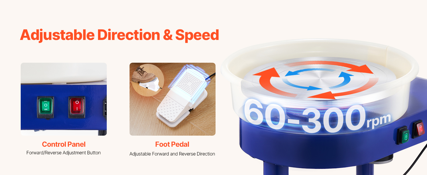 Hrnčiarsky kruh poskytuje dva režimy ovládania: pomocou tlačidiel môžete nastaviť smer otáčania podľa rôznych potrieb. Počas výroby umožňuje nožný pedál bez použitia rúk ovládať smer a rýchlosť, vďaka čomu sa môžete plne sústrediť na svoj výtvor.