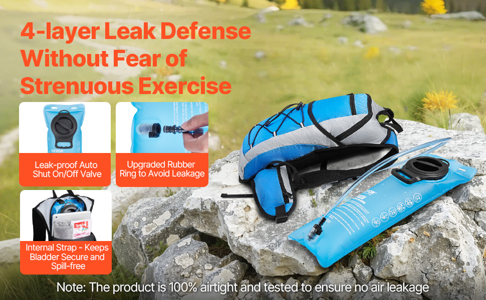 Bežecký batoh sa dodáva so štvorvrstvovou konštrukciou odolnou proti úniku vody. Obsahuje automatický uzatvárací/vypínací ventil, vylepšený gumový krúžok a zabezpečovacie popruhy. Náš hydratačný batoh prechádza 100 % testovaním vzduchotesnosti, čo zaručuje, že nedôjde k úniku ani počas intenzívnych aktivít.