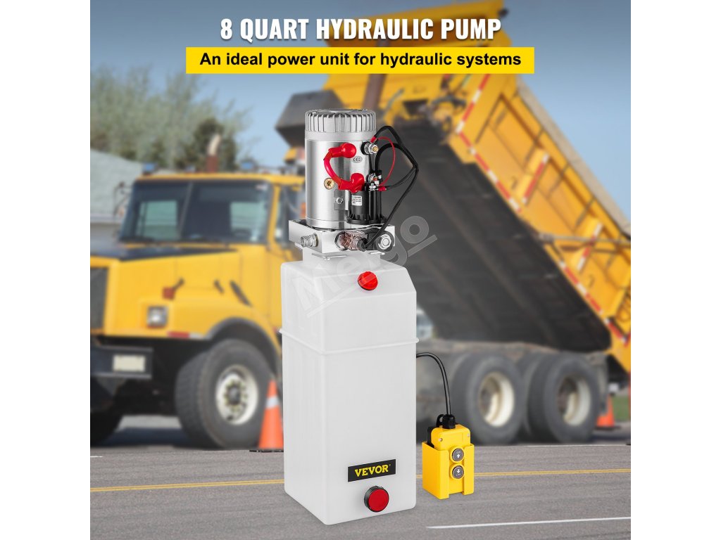 Táto jednočinná hydraulická pohonná jednotka má 12 V motor na jednosmerný prúd (výkon: 0,37 - 5,5 kW) a 8-kvartovú plastovú nádrž; má porty SAE#6 s maximálnym nastavením odľahčenia 3200 PSI na porte A a 1500 PSI na porte B. Prietok je 2GPM. Menovité otáčky: 2850 ot/min.