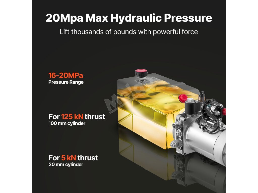 Táto hydraulická pohonná jednotka využíva motor s výkonom 1,6 kW pri 2 600 otáčkach za minútu, ktorý dosahuje pracovný tlak 16-20 MPa a až 22 MPa (3 200 psi). Poháňate valce s istotou, vysokým výkonom zdvíhania a stabilným výkonom pri náročných prácach.