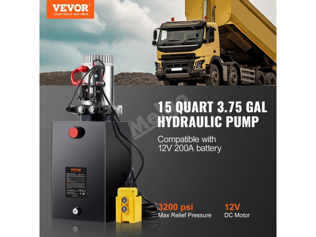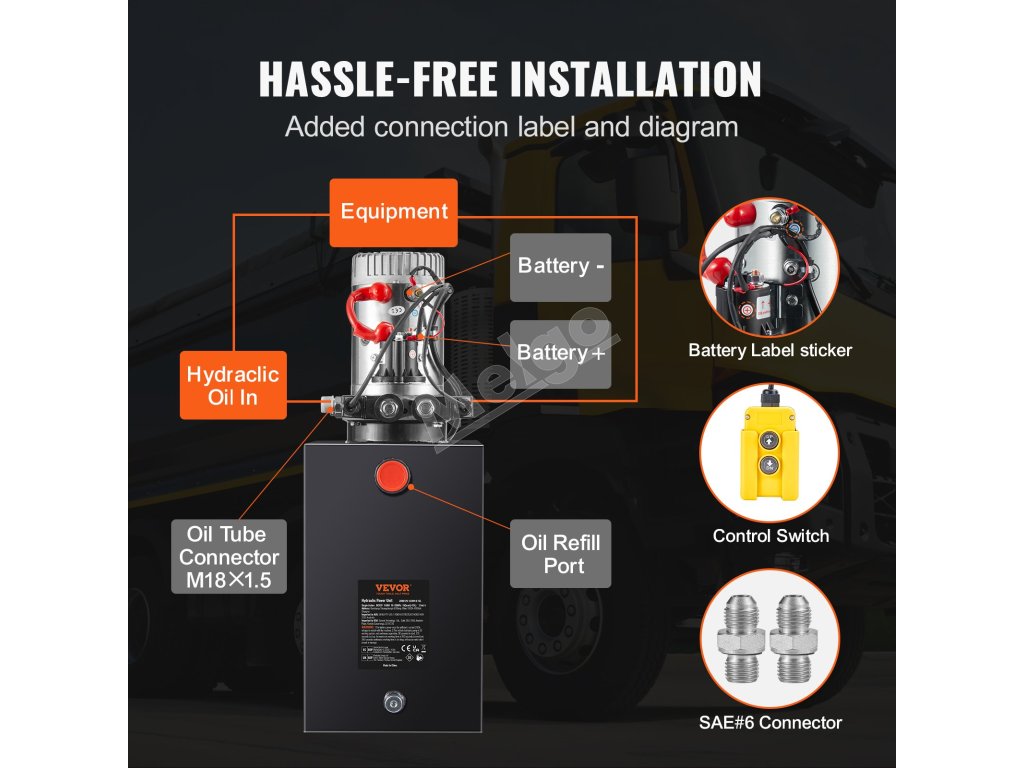 Hydraulické čerpadlo VEVOR je vybavené 12 V DC motorom s výkonom 1,6 kW. Dvojčinná pohonná jednotka zabezpečuje stabilné zdvíhanie. Stačí len pridať hydraulický olej, pripojiť napájanie a hadice. Nie je potrebné žiadne zložité nastavovanie. Je univerzálne pre veľké stroje, strihacie vidlice, výťahy, vysokozdvižné vozíky a ďalšie.