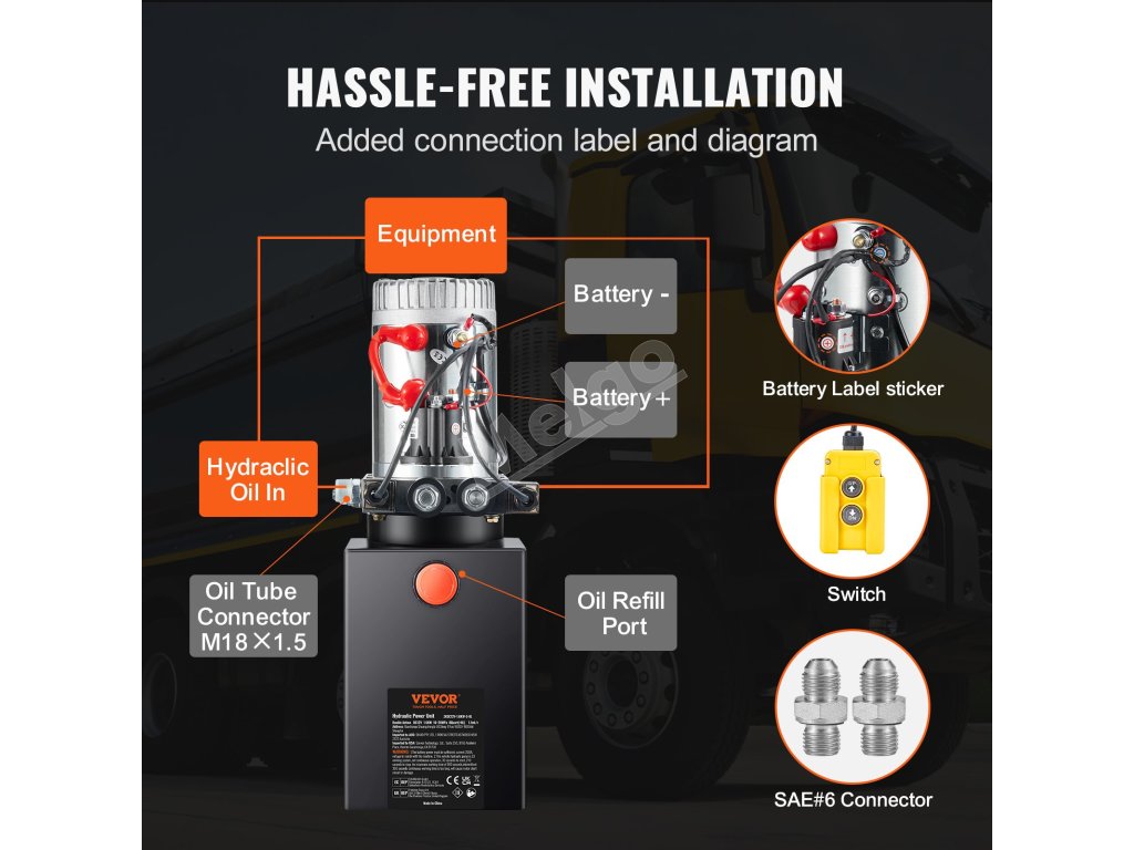 Hydraulické čerpadlo VEVOR je vybavené 12 V DC motorom s výkonom 1,6 kW. Dvojčinná pohonná jednotka zabezpečuje stabilné zdvíhanie. Stačí len pridať hydraulický olej, pripojiť napájanie a hadice. Nie je potrebné žiadne zložité nastavovanie. Je univerzálne pre veľké stroje, strihacie vidlice, výťahy, vysokozdvižné vozíky a ďalšie.