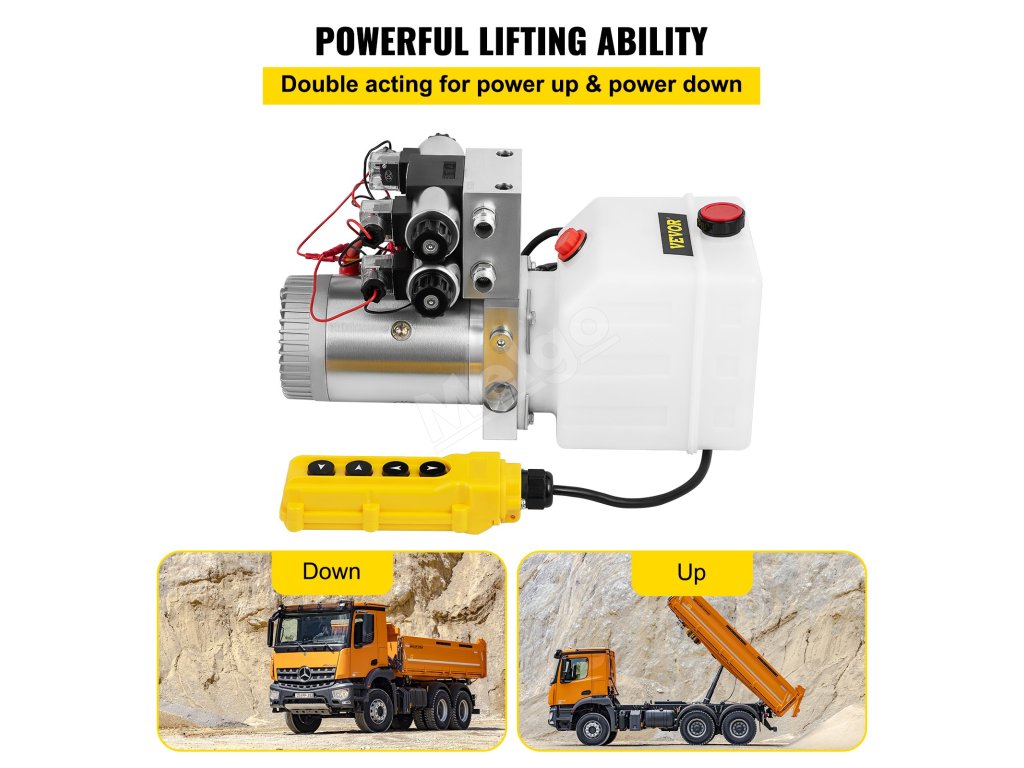 Ako skvelú pohonnú jednotku možno toto hydraulické čerpadlo použiť na mnoho vecí, napríklad na zdvíhanie zadných dverí nákladných vozidiel, vyrovnávanie RV, nožnicový zdvihák, sklápacie prívesy, zdvíhacie vozíky, snehové pluhy, letecké plošiny, dopravné značky, manipuláciu s materiálom, zdvíhacie zariadenia pre invalidné vozíky atď.
