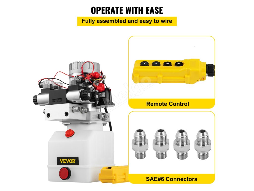 Naše hydraulické elektrické čerpadlo bolo kompletne zmontované. Dodáva sa s ručným diaľkovým ovládaním a 2 ďalšími konektormi SAE#6 na výmenu. Celá pohonná jednotka sa ľahko zapája a ľahko ovláda.