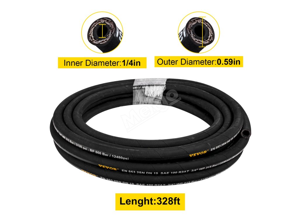 Hromadná hydraulická hadica má dĺžku 328 stôp, vnútorný priemer 1/4 palca a vonkajší priemer 0,59 palca.