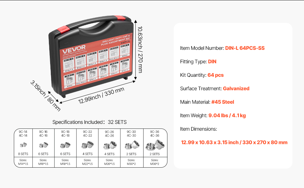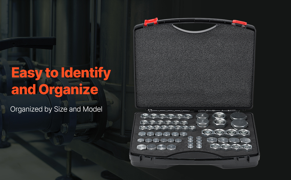 Táto súprava ponúka široký rozsah rozmerov, vysoko presné závity a netesniace tesnenia. Sú vyrobené z odolnej pozinkovanej ocele č. 45 a sú odolné voči korózii. Vďaka rozdelenému úložnému priestoru a označenej stupnici sú prenosné a ideálne pre priemyselné, poľnohospodárske a strojárske stroje.