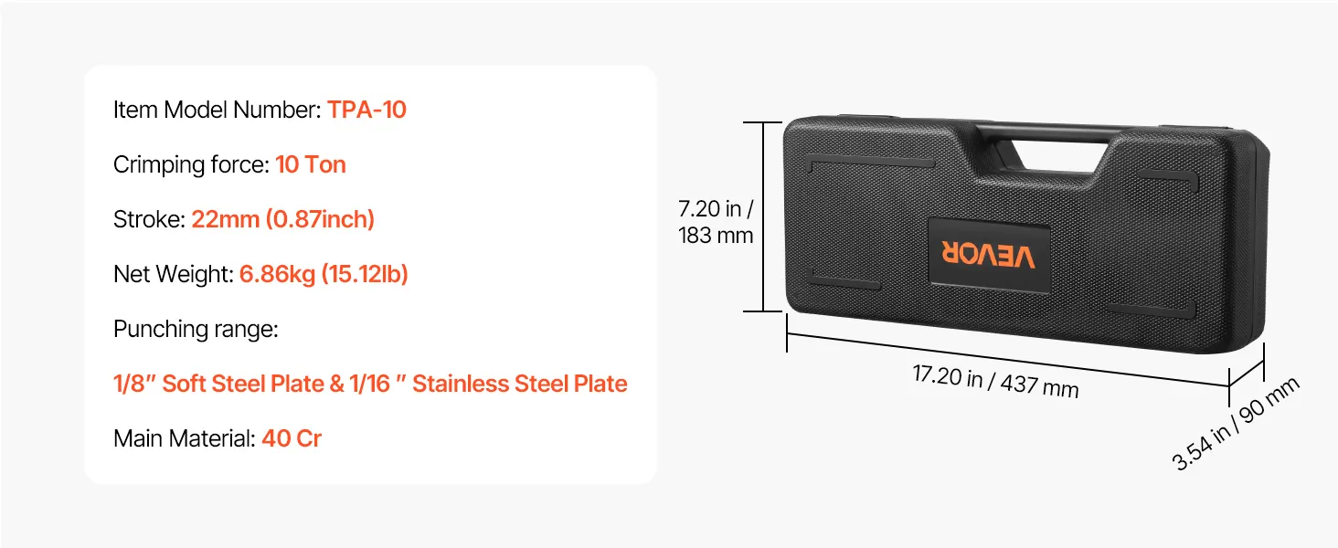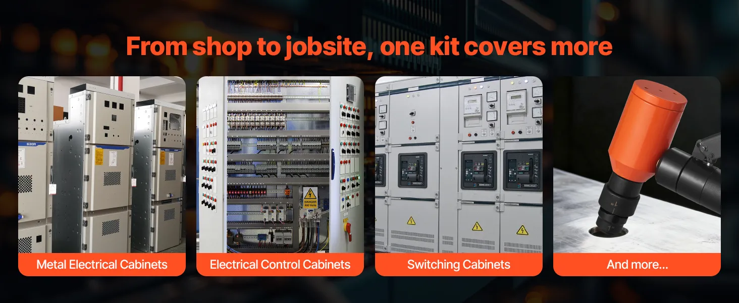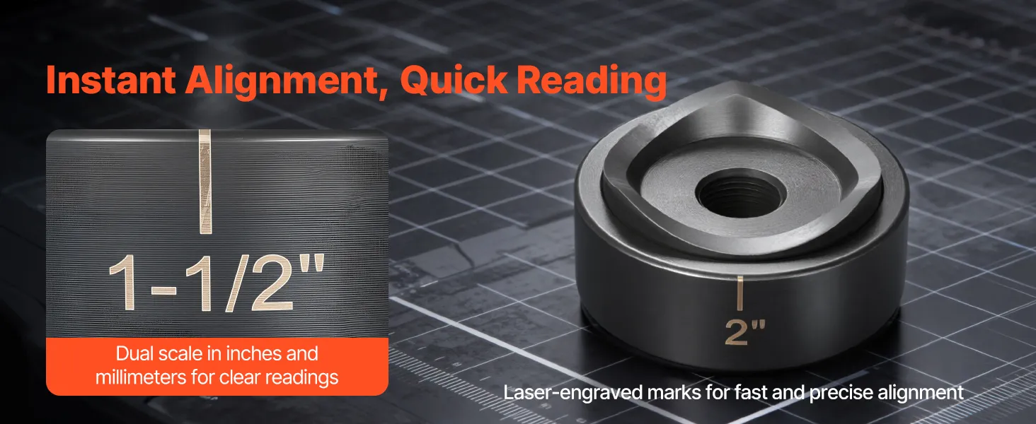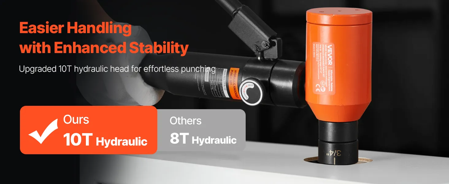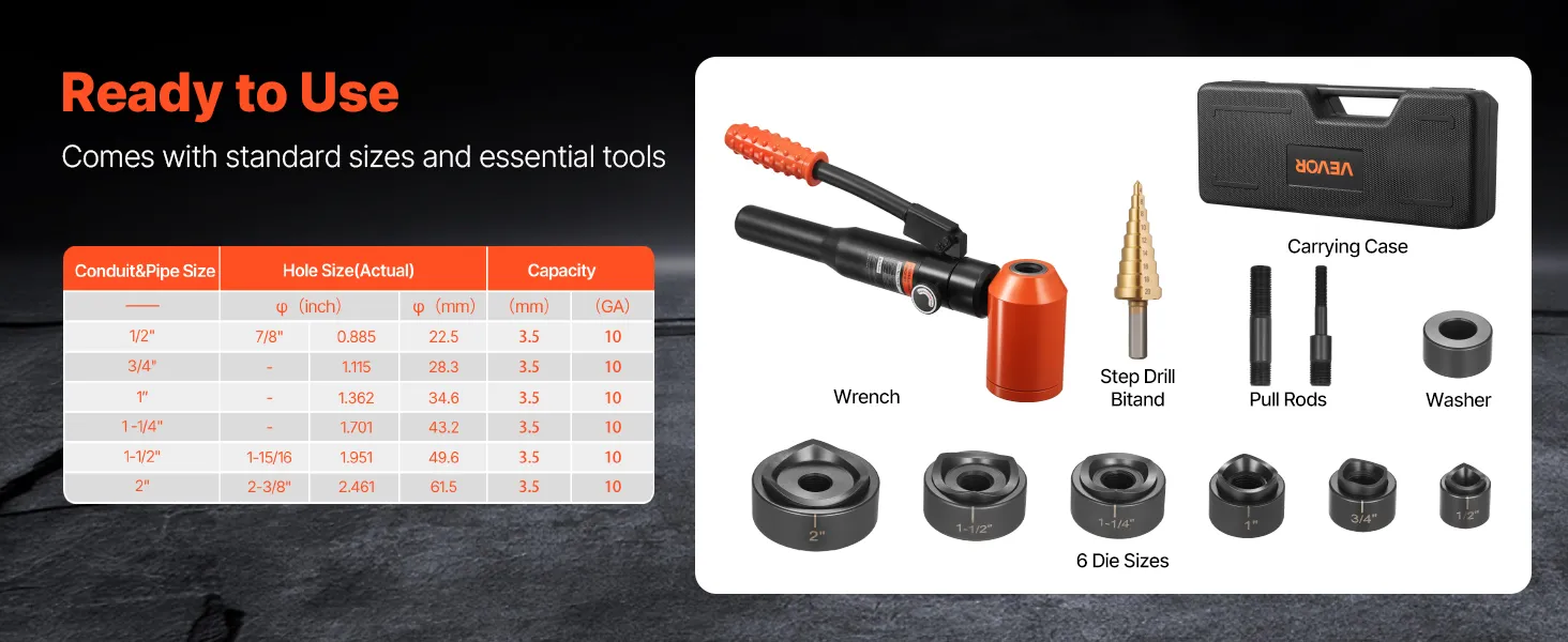 So 6 razidlami ((1/2" až 2"/12,7 až 50,8 mm) pokrýva táto súprava vyraďovacích dierovačov s hmotnosťou 10 ton/98,07 kN celý rad veľkostí otvorov. Laserové značky stupnice umožňujú rýchle a presné polohovanie; dvojité stupnice v palcoch a milimetroch umožňujú jednoduché čítanie. Nízkoprofilové razníky a hydraulické zariadenie sa účinne dostanú do stiesnených alebo vyvýšených priestorov.