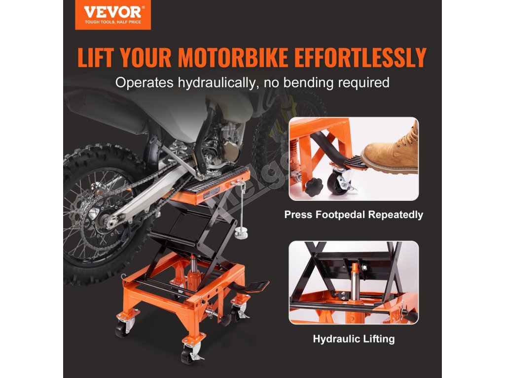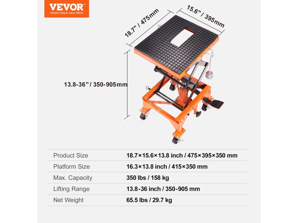 Nosnosť: 350 lbs/158 kg. Motocyklový zdvihák je vybavený vysokopevnostnou prevodovkou so šnekovým prevodom a odolnou pevnou oceľovou strižnou konštrukciou, ktorá šetrí námahu a znižuje odpor pri rýchlom zdvíhaní rôznych terénnych motocyklov.