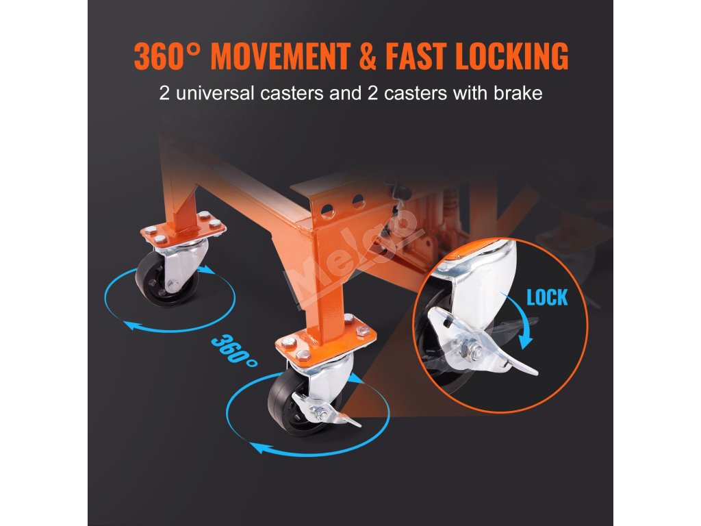 Je vybavený 2 univerzálnymi kolieskami a 2 uzamykateľnými kolieskami, ktoré vám umožňujú jednoduché premiestňovanie. Keď zdvihák na motocykle dosiahne požadovanú polohu, jednoducho uzamknite kolieska, aby ste dosiahli stabilitu počas používania.