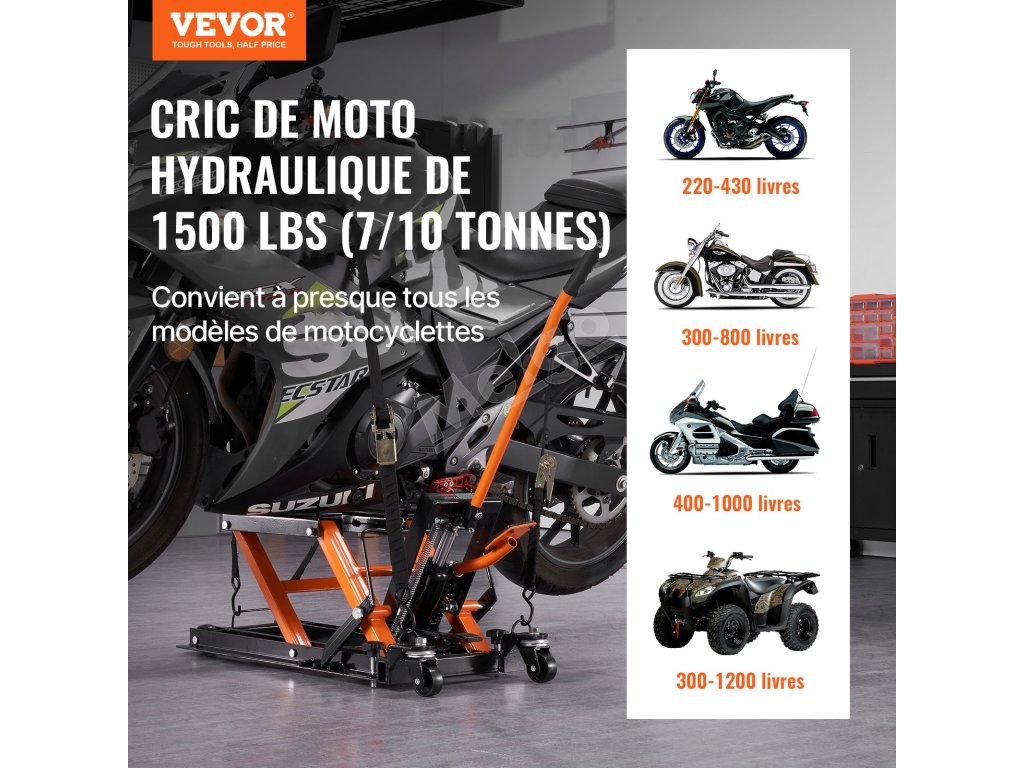 Aby sa zabezpečila jeho vysoká nosnosť, tento výrobok prechádza rôznymi testami nosnosti, ktoré potvrdzujú jeho pevnosť a spoľahlivosť. To znamená, že zvládne manipuláciu so širokou škálou vozidiel. Týmto spôsobom môžete tento zdvihák používať na zdvíhanie rôznych typov motocyklov vrátane cruiserov, cestovných motocyklov, štvorkoliek a iných modelov.