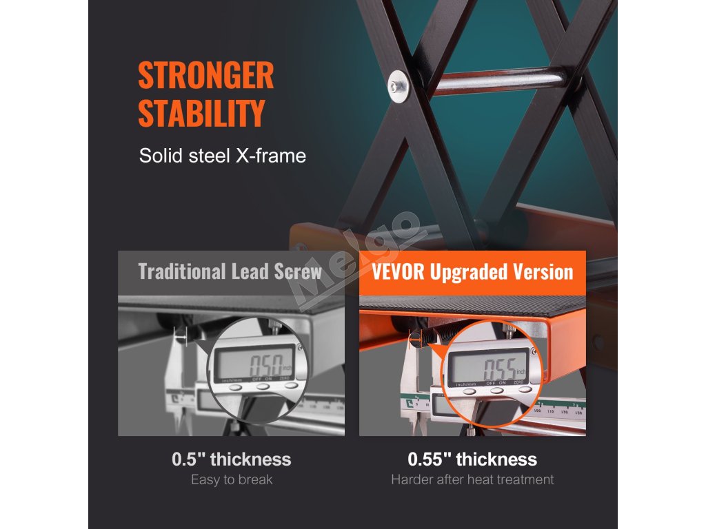 Nožnicový zdvihák na motocykle VEVOR je skonštruovaný tak, aby vydržal. Zvládne až 1100 kg, vďaka čomu je vhodný pre rôzne typy motocyklov. Robustná oceľová konštrukcia zaručuje odolnosť a spoľahlivosť. Jeho široká plošina poskytuje dostatok priestoru a stability, vďaka čomu je bezpečná. Hydraulický systém zdviháka je silný a plynulý, čo zabezpečuje jednoduché ovládanie. Tento zdvihák je ideálny na náročné úlohy a poskytuje spoľahlivú platformu pre váš motocykel. Jeho vysoká nosnosť a pevná konštrukcia z neho robia spoľahlivú voľbu pre majiteľov motocyklov.