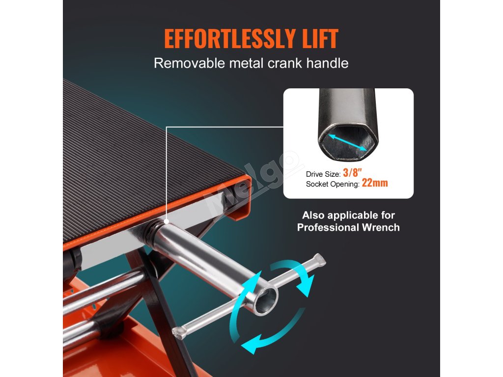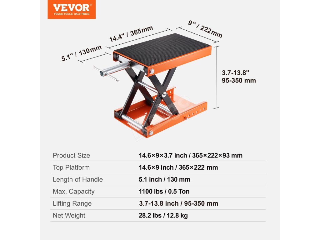 Zdvihák na motocykle VEVOR je ideálny pre domáce aj profesionálne dielne. Má pevnú konštrukciu a vysokú nosnosť. Vďaka týmto vlastnostiam je vhodný na profesionálne použitie. Vďaka jednoduchému používaniu a bezpečnostným prvkom je zdvihák ideálny pre domáce dielne, či už ste profesionál, alebo amatér. Tento zdvihák spĺňa vaše potreby. Na svojom bicykli môžete pracovať bezpečne a efektívne bez ohľadu na prostredie.